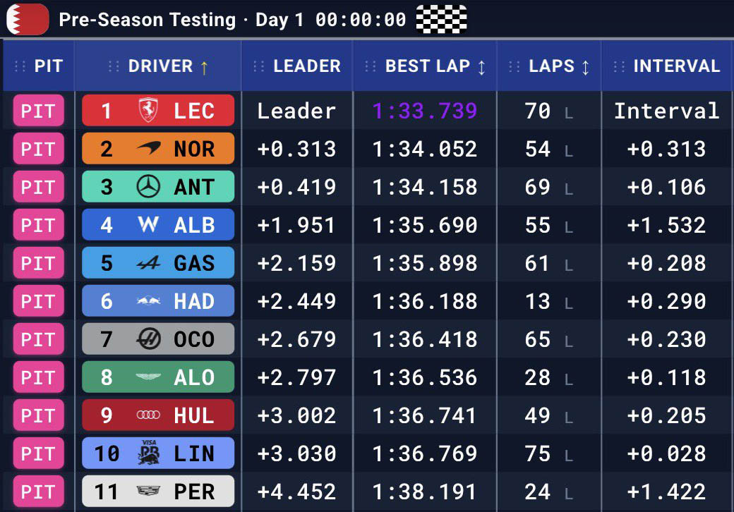 Ο Charles Leclerc ξεκίνησε αυτό το τελικό τεστ γράφοντας τον ταχύτερο χρόνο με τη Ferrari, ο οποίος ήταν μόλις 0,07 δλ. πίσω από τον ταχύτερο της προηγούμενης εβδομάδας (του Andrea Kimi Antonelli με τη Mercedes), ο οποίος σημειώθηκε σε πιο ευνοϊκές συνθήκες και θερμοκρασίες. Άρα η βελτίωση των μονοθεσίων είναι ήδη αισθητή.