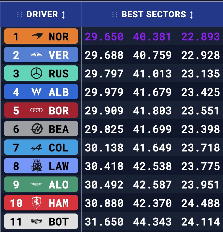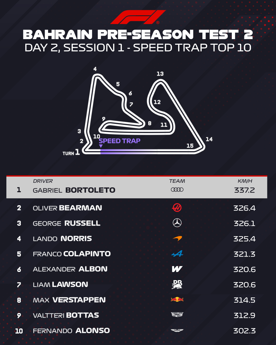 Μόλις 0,016 δλ. πίσω από την Audi ήταν ο Oliver Bearman με τη Haas, ακολουθούμενος από τον Franco Colapinto με την Alpine. O Liam Lawson ήταν άλλο 1,5 δλ. πίσω, καθώς έκανε μόλις 27 γύρους με τη Racing Bulls. Και πάλι όμως, ήταν ταχύτερος από τον Fernando Alonso, που έκανε 40 γύρους με την Aston Martin. O Pedro de la Rosa εξήγησε ότι το χθεσινό τετ-α-κέ του Lance Stroll είχε προκληθεί από τον τρόπο με τον οποίο ανακτούν ενέργεια οι φετινές μονάδες ισχύος σε συνδυασμό με τα κατεβάσματα στο νέο κιβώτιο της ομάδας.