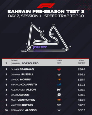 Ο Max Verstappen σημείωσε με τη Red Bull τη δεύτερη ταχύτερη επίδοση του πρωινού σκέλους, η ολοκλήρωση του οποίου σημαίνει ότι το τελικό τεστ στο Μπαχρέιν έχει φτάσει ήδη στο μέσο του. Ο Ολλανδός βρέθηκε μόλις 0,13 δλ. μακριά από την κορυφή και στις μεγάλες ακολουθίες γύρων, ακολουθούσε παρόμοια στρατηγική: προετοίμαζε τα ελαστικά στην αρχή του stint, στη συνέχεια πίεζε πιο επιθετικά και μετά αντιμετώπιζε καταπόνηση, με τους χρόνους να ανεβαίνουν.