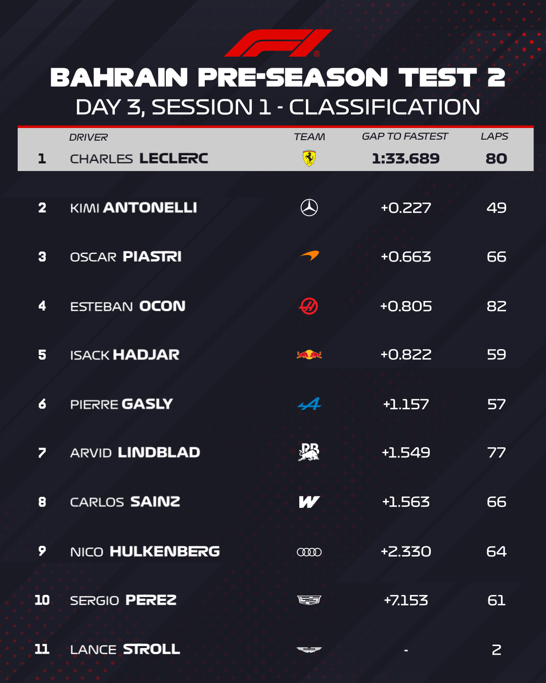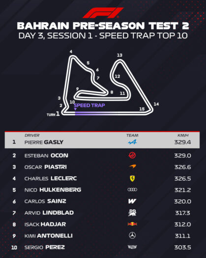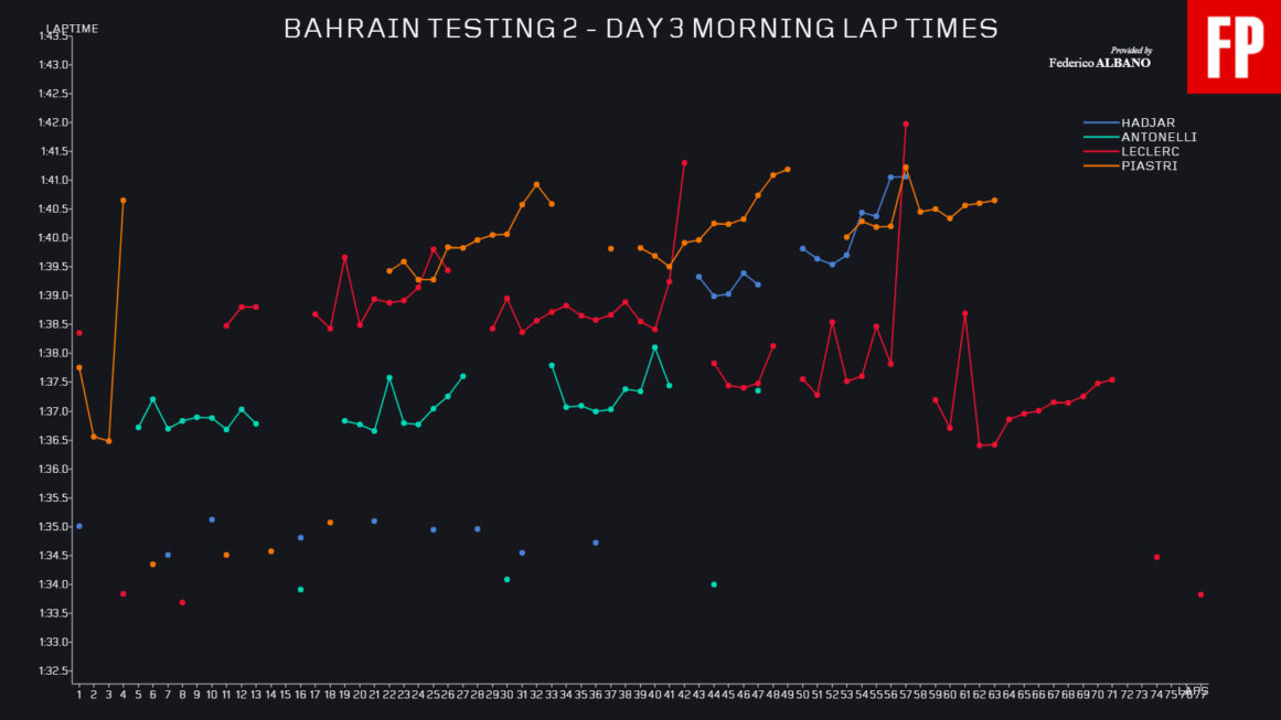 Η τελευταία ημέρα των δοκιμών προετοιμασίας της Formula 1 στο Μπαχρέιν πριν από την έναρξη της σεζόν του 2026 είδε τον Charles Leclerc να σημειώνει τον ταχύτερο χρόνο του πρωινού σκέλους με τη Ferrari, πριν πραγματοποιήσει μία προσομοίωση αγώνα με καλό ρυθμό, αλλά κάποιιες αυξομειώσεις στους χρόνους, ολοκληρώνοντας συνολικά 80 γύρους. Η σημερινή επίδοση του Μονεγάσκου οδηγού ήταν 0,886 δλ. πιο αργή από το χθεσινό χρόνο του Andrea Kimi Antonelli το απόγευμα.