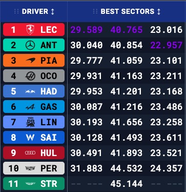 Επίσης, ο Ocon κατάφερε να βρεθεί εμπρός από τη Red Bull του Isack Hadjar στους χρόνους, για μόλις 0,017 δλ. Ο Pierre Gasly βρέθηκε στην 6η θέση με την Alpine, ολοκληρώνοντας την τριάδα Γάλλων εμπρός από τον Arvid Lindblad, ο οποίος δυσκολευόταν με τη νευρική Racing Bulls.