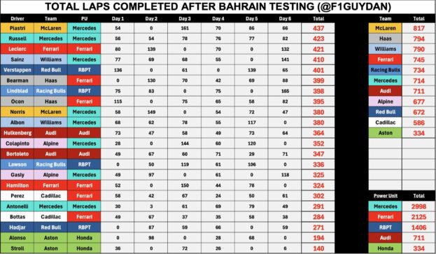 O Arvid Lindblad (9ος) ήταν ο οδηγός που ολοκλήρωσε τους περισσότερους γύρους σήμερα, με 165, και στο τέλος έκανε -πολύ χρήσιμη, ενόψει του πρώτου του αγώνα- προπόνηση pit stop με την ομάδα της Racing Bulls. Την πρώτη δεκάδα συμπλήρωσε ο Carlos Sainz με τη Williams. Η Aston Martin ολοκλήρωσε την ημέρα της έχοντας κάνει μόλις 6 γύρους, καθώς η ομάδα βρίσκεται σε πολύ κακό στάδιο προετοιμασίας με τη μονάδα ισχύος της Honda να μη φαίνεται να είναι έτοιμη ακόμα όσον αφορά την αξιοπιστία.