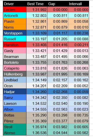 Η McLaren έχασε τις δύο πρώτες ώρες από το απογευματινό τετράωρο σκέλος, αλλά ο Lando Norris ήταν γρήγορος προς το τελος της διαδικασίας. Ο Βρετανός Πρωταθλητής, με τη McLaren εφοδιασμένη με πιο σκληρά ελαστικά γόμας C3, βρέθηκε 0,88 δλ. μακριά από την ταχύτερη επίδοση του Leclerc. Η McLaren φαίνεται να βρίσκεται λίγο πιο πίσω από τις δύο προαναφερθείσες ομάδες, αλλά πιθανώς σε απόσταση αρκετά μικρή ώστε να μπορεί να επιτεθεί.