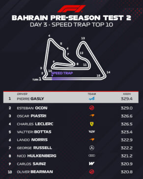 Την πρώτη τριάδα στον πίνακα των χρόνων συμπλήρωσε ο Max Verstappen με επίδοση 1,11 δλ. μακριά από την κορυφή. Η Red Bull φαίνεται να είναι η 4η ομάδα από τις ενδείξεις του τεστ του Μπαχρέιν, αλλά υπάρχουν κάποιοι που υποστηρίζουν ότι έχει περιορίσει την απόδοση της μονάδας ισχύος.