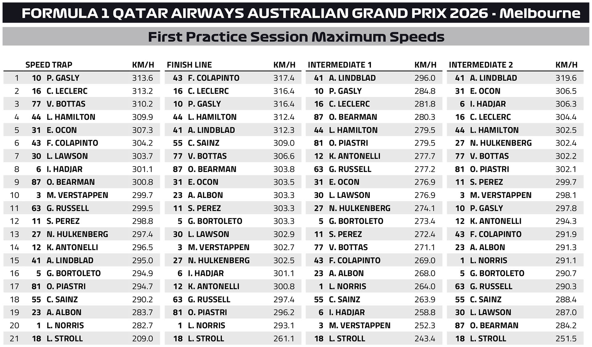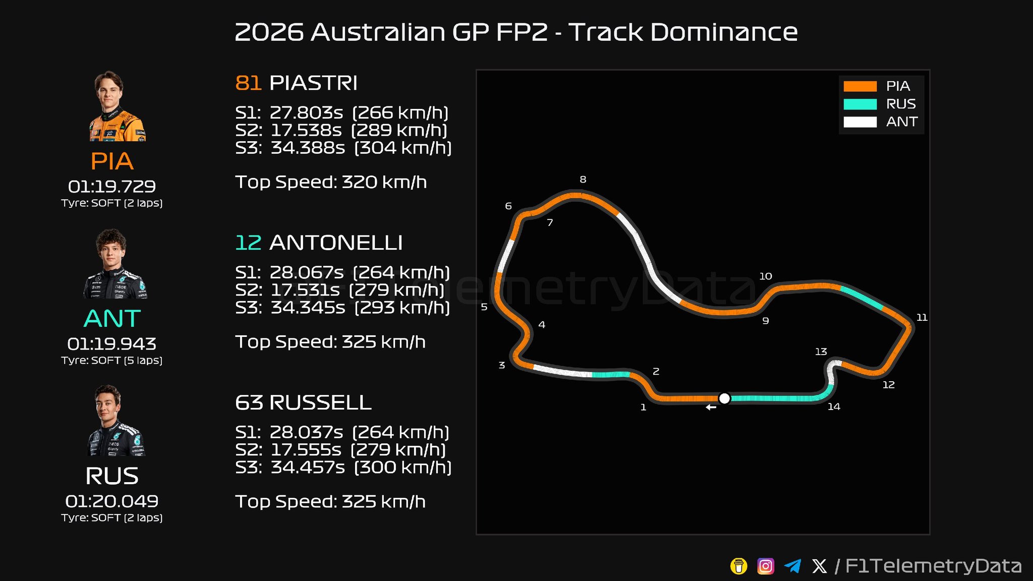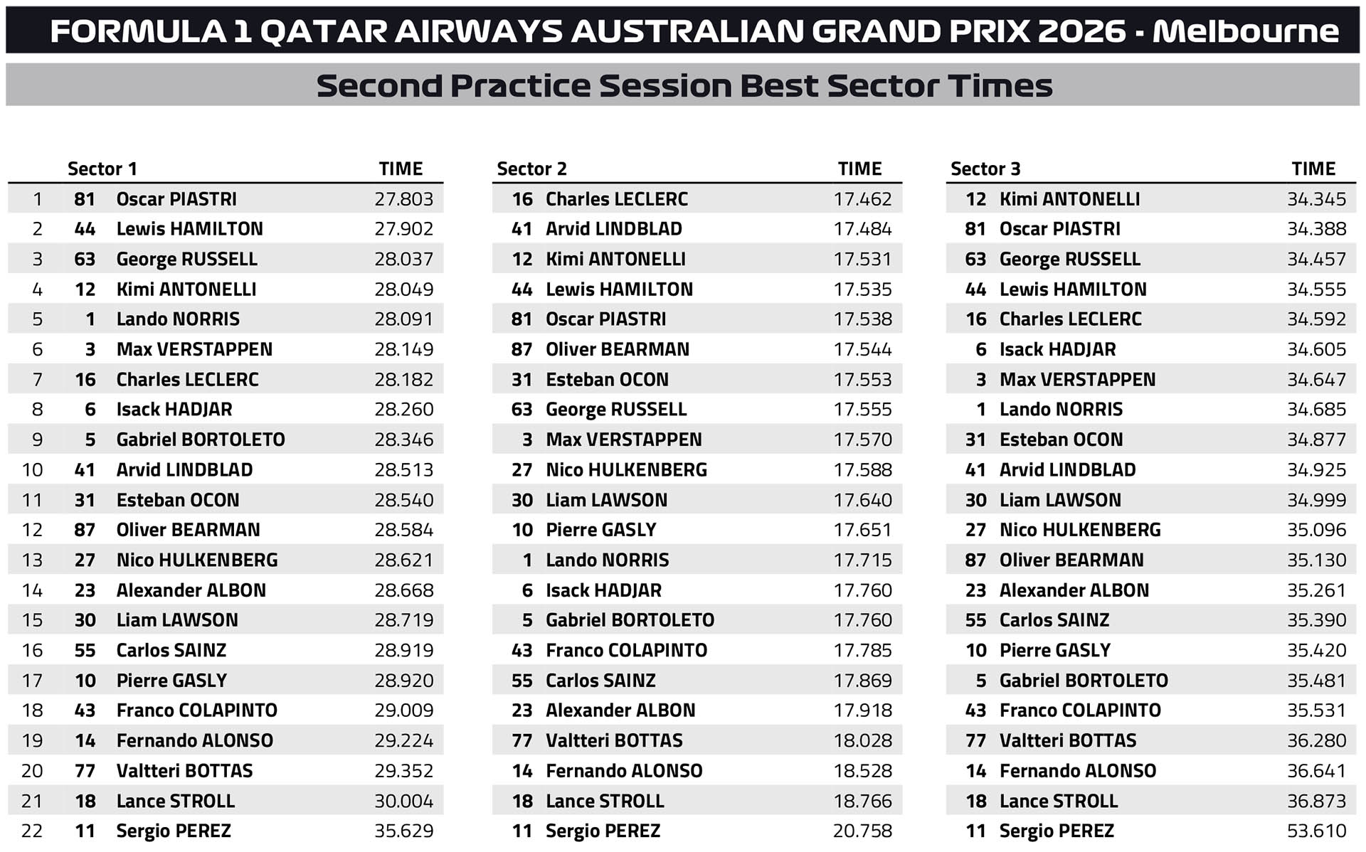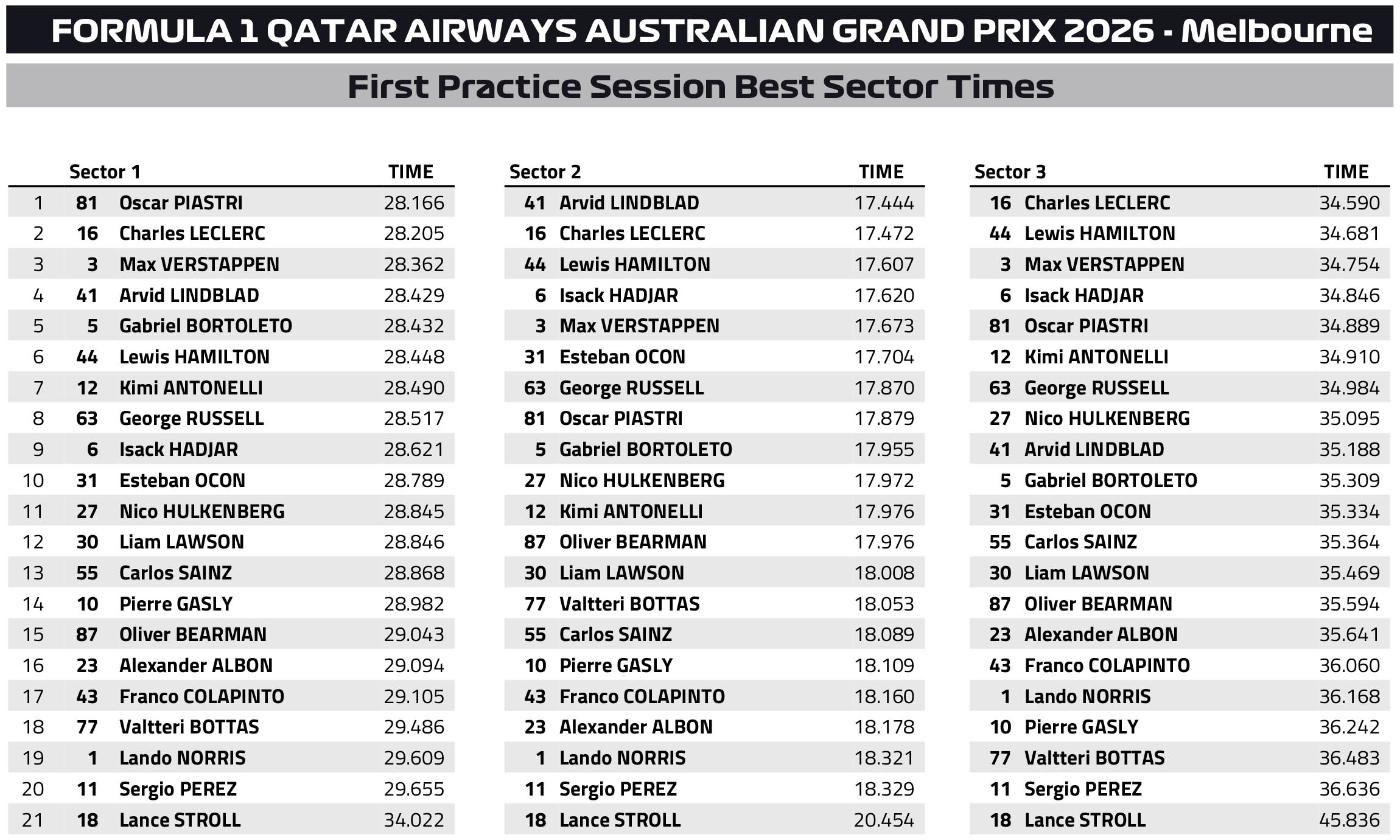 Μέσα στην πατρίδα του, ο Oscar Piastri έγραψε τον ταχύτερο χρόνο της ημέρας με τη McLaren, με επίδοση 0,21 δλ. ταχύτερη από τους αντιπάλους του, με τους δύο οδηγούς της Mercedes να τον ακολουθούν. Η ημέρα της McLaren δεν ξεκίνησε με τον ιδανικό τρόπο, καθώς ο Lando Norris αντιμετώπισε πρόβλημα με το συμπλέκτη του μονοθεσίου του στο FP1 και πρόλαβε να συμπληρώσει μόλις 7 γύρους.