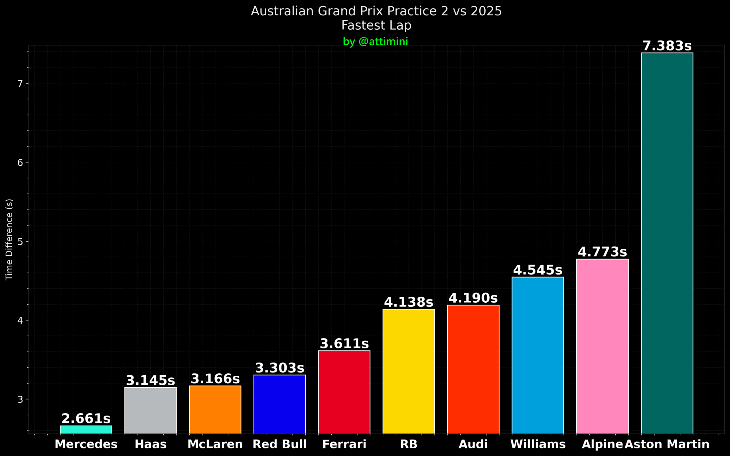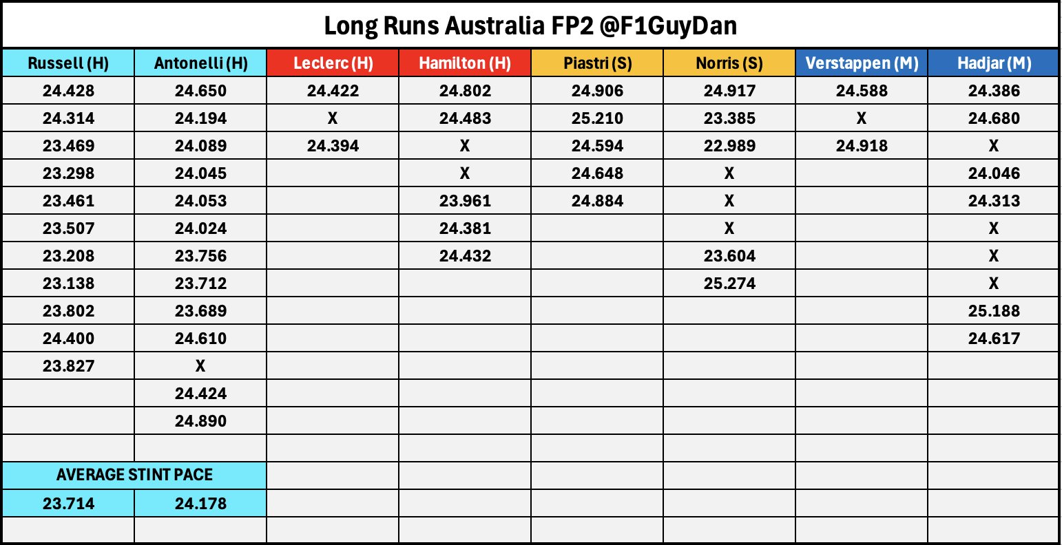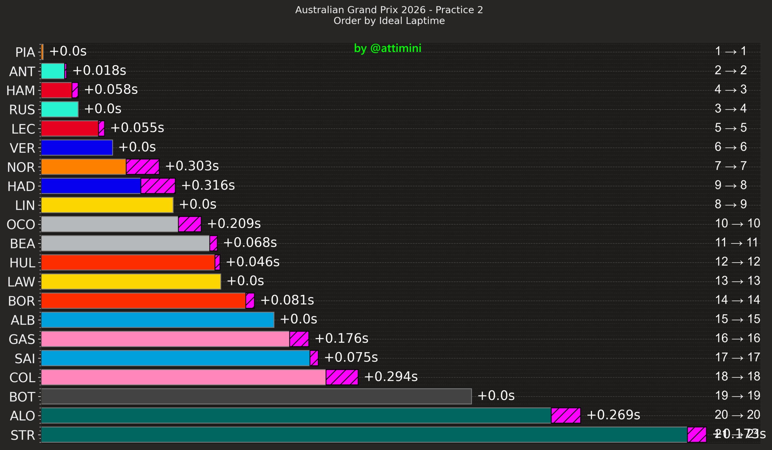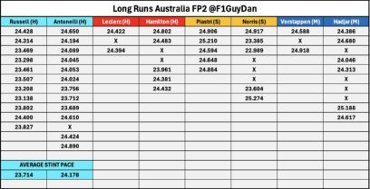 Μέσα στην πατρίδα του, ο Oscar Piastri έγραψε τον ταχύτερο χρόνο της ημέρας με τη McLaren, με επίδοση 0,21 δλ. ταχύτερη από τους αντιπάλους του, με τους δύο οδηγούς της Mercedes να τον ακολουθούν. Η ημέρα της McLaren δεν ξεκίνησε με τον ιδανικό τρόπο, καθώς ο Lando Norris αντιμετώπισε πρόβλημα με το συμπλέκτη του μονοθεσίου του στο FP1 και πρόλαβε να συμπληρώσει μόλις 7 γύρους.