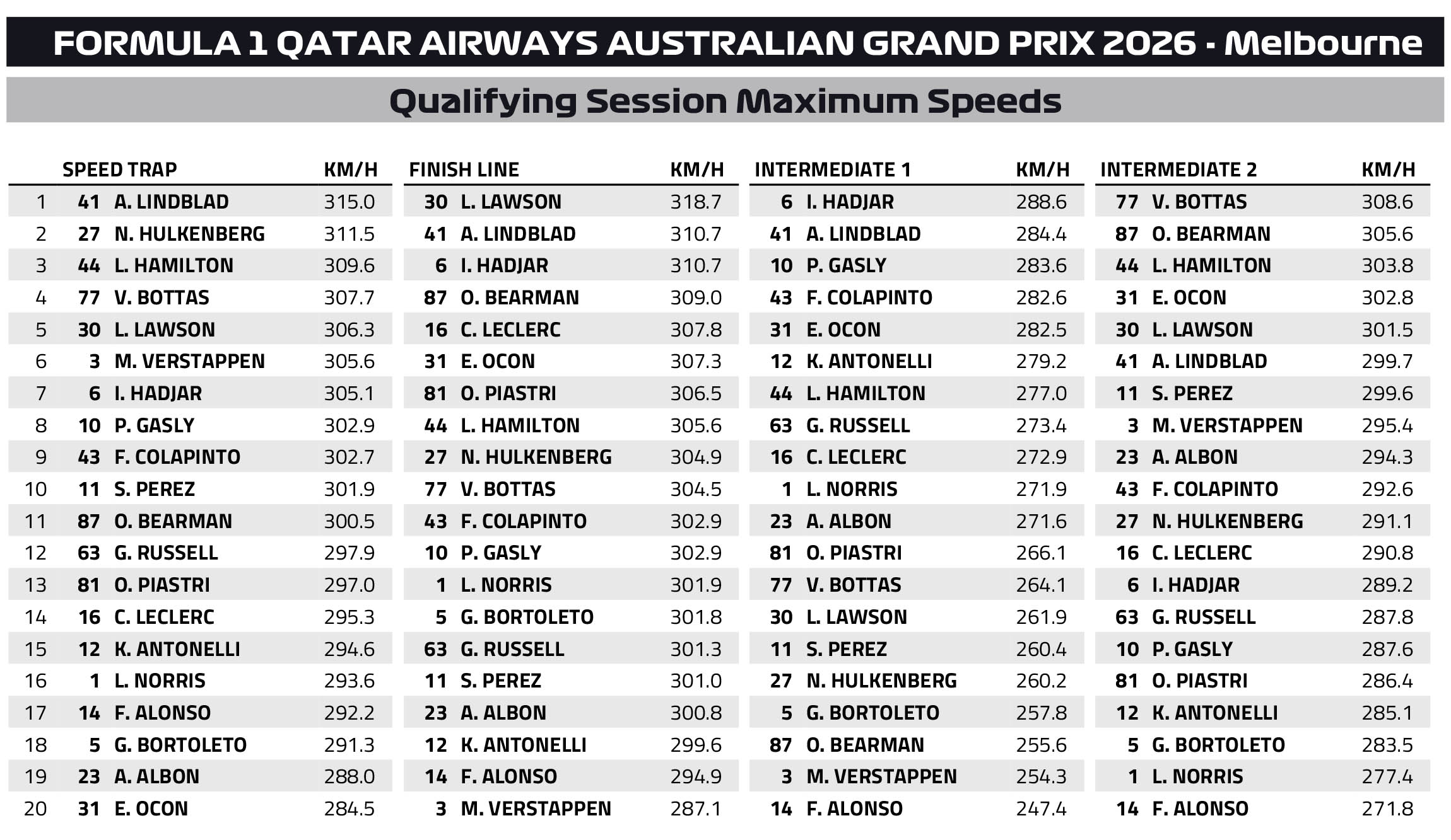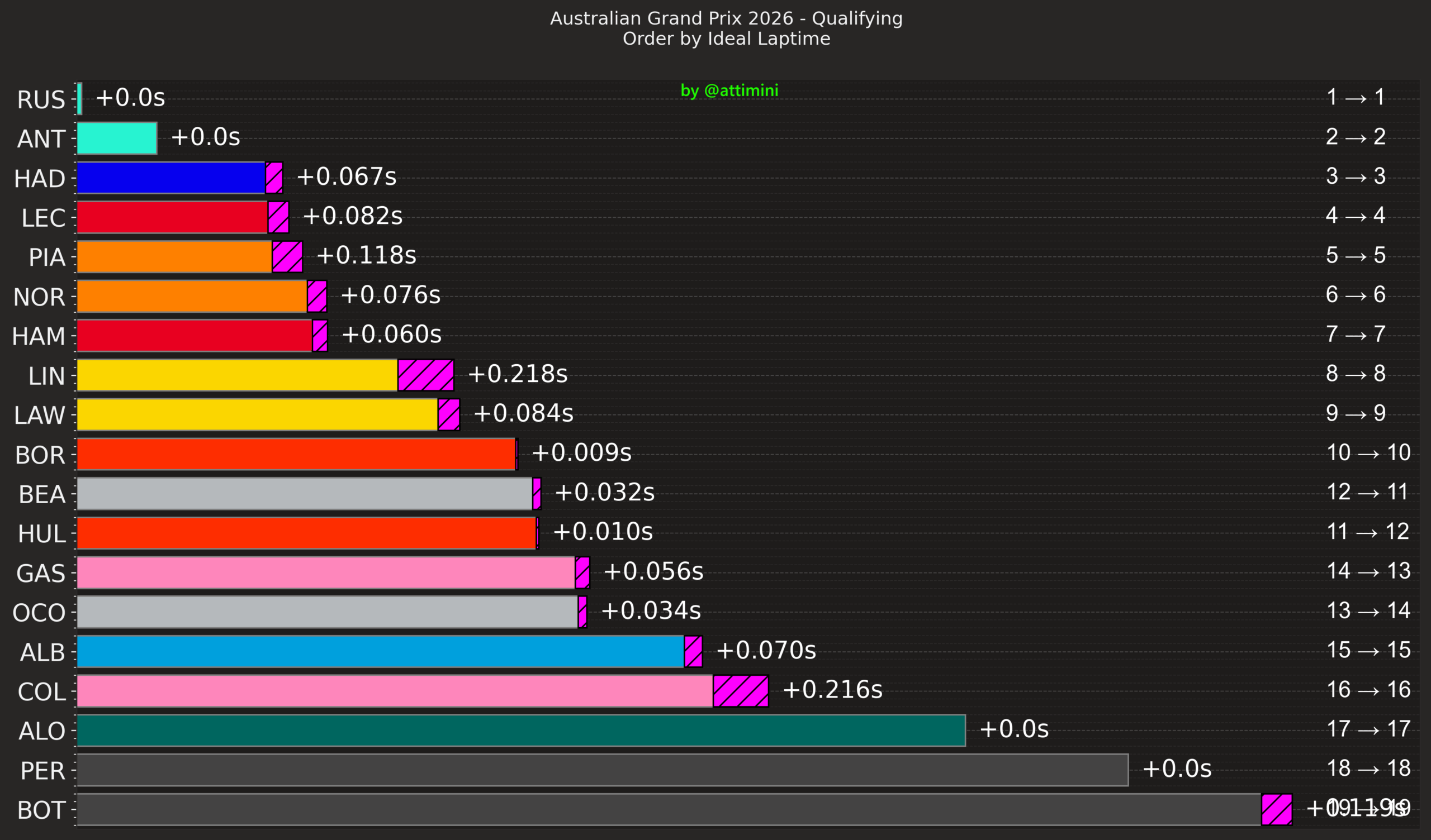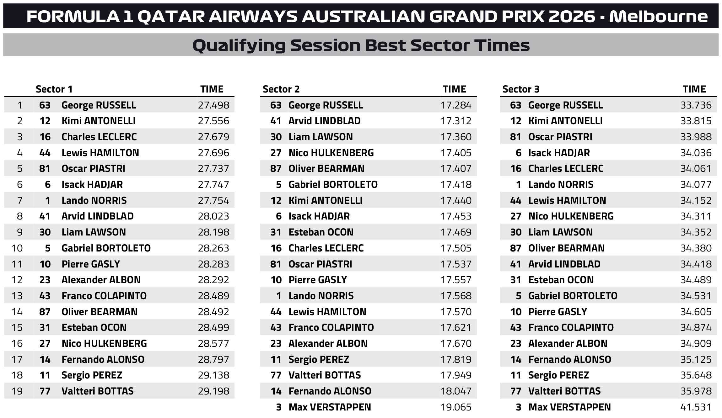 Οι αγωνοδίκες θα εξετάσουν το περιστατικό για να αποφασίσουν αν υπήρξε απελευθέρωση του μονοθεσίου σε μη ασφαλή κατάσταση από τη Mercedes. Στην πρώτη του γρήγορη προσπάθεια στο Q3, ο Antonelli βγήκε εκτός πίστας στην 3η στροφή, έχοντας μπλοκάρει τα φρένα του, αλλά στο τέλος κατάφερε να εξασφαλίσει μία θέση στην πρώτη σειρά εκκίνησης, η οποία μάλλον δεν θα απειληθεί. Περιμένουμε μόνο οικονομικό πρόστιμο στην ομάδα για τις παρατυπίες.