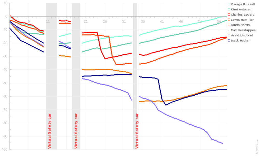Ωστόσο, έπειτα από την εγκατάλειψη του Isack Hadjar από την 4η θέση με πρόβλημα στη μονάδα ισχύος της Red Bull, η Mercedes άρπαξε την ευκαιρία του εικονικού αυτοκινήτου ασφαλείας για να πραγματοποιήσει τα pit stop των οδηγών της χάνοντας 10 δλ. λιγότερα. Ο Russell είχε ενημερώσει από τον ασύρματο ότι το VSC θα διαρκούσε αρκετά, προειδοποιώντας τη Mercedes ότι θα είχε χρόνο να τον καλέσει στα pits.