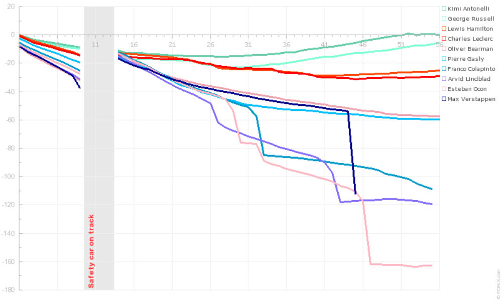 Έως τον 29ο γύρο, που ο Russell πέρασε μπροστά από τις Ferrari, ο Antonelli είχε απομακρυνθεί 8 δλ. πλέον. Ο Βρετανός προσπάθησε να μειώσει τη διαφορά και τα κατάφερε για λίγο, γράφοντας ταχύτερους γύρους, αλλά στη συνέχεια τα ελαστικά του άρχισαν να υποχωρούν, όντας πιο ταλαιπωρημένα από τις μάχες που έδωσε με τις Ferrari.