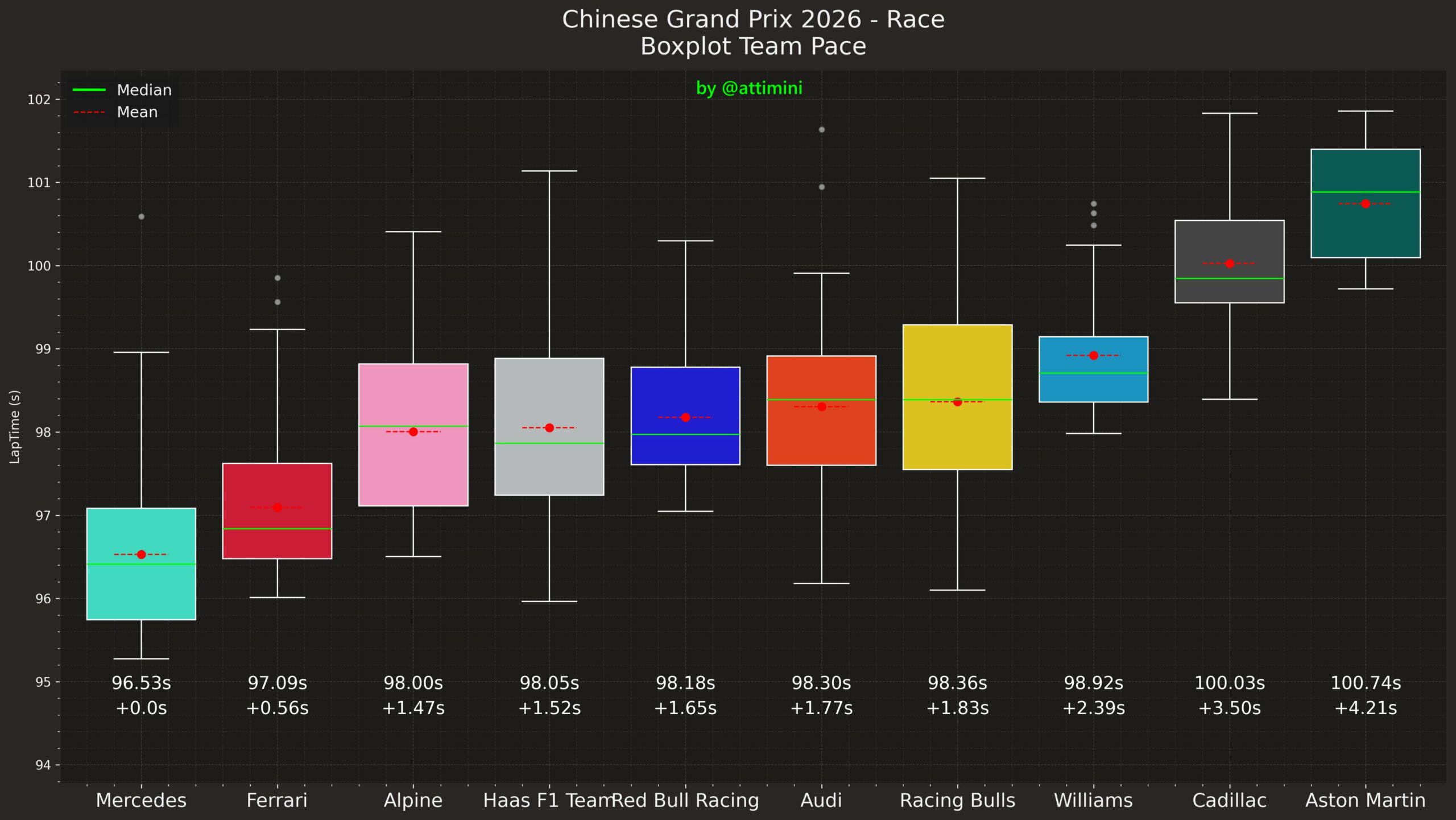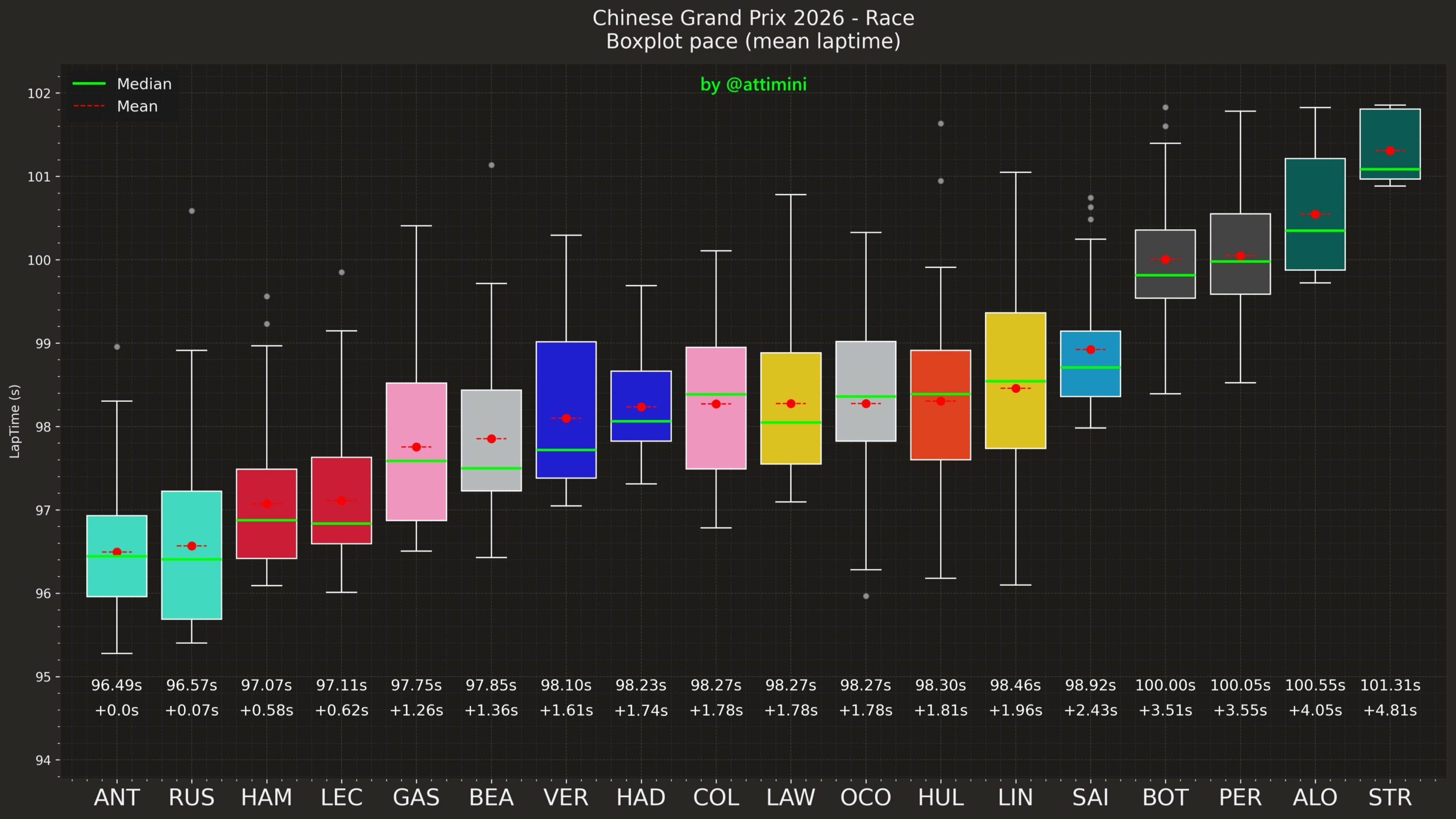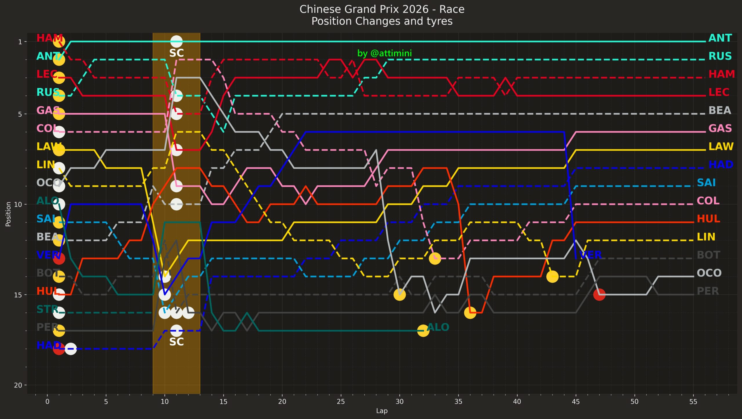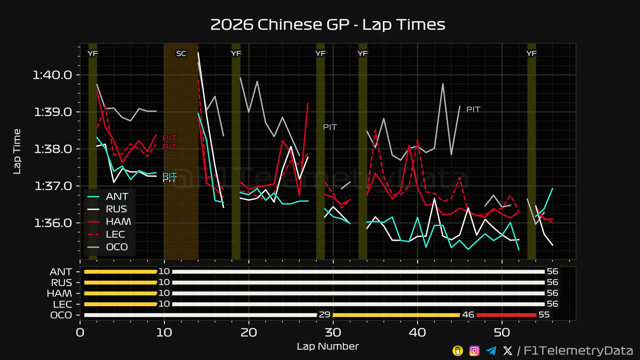 Όταν ο Hamilton, έχοντας προσπεράσει αυτούς που δεν είχαν κάνει pit stop, κατάφερε να βρεθεί σε απόσταση ενός δευτερολέπτου από τον Antonelli, ο Ιταλός είχε προετοιμάσει πλέον τα ελαστικά του για να έχει τη δυνατότητα να μην επιτρέψει στον άνθρωπο που αντικατέστησε στη Mercedes να πλησιάσει. Στη συνέχεια, ξεδίπλωσε τις δυνατότητες της Mercedes και απομακρύνθηκε από τους διώκτες του (τις Ferrari και τον team-mate του), όταν αυτοί ξεκίνησαν να μάχονται μεταξύ τους.