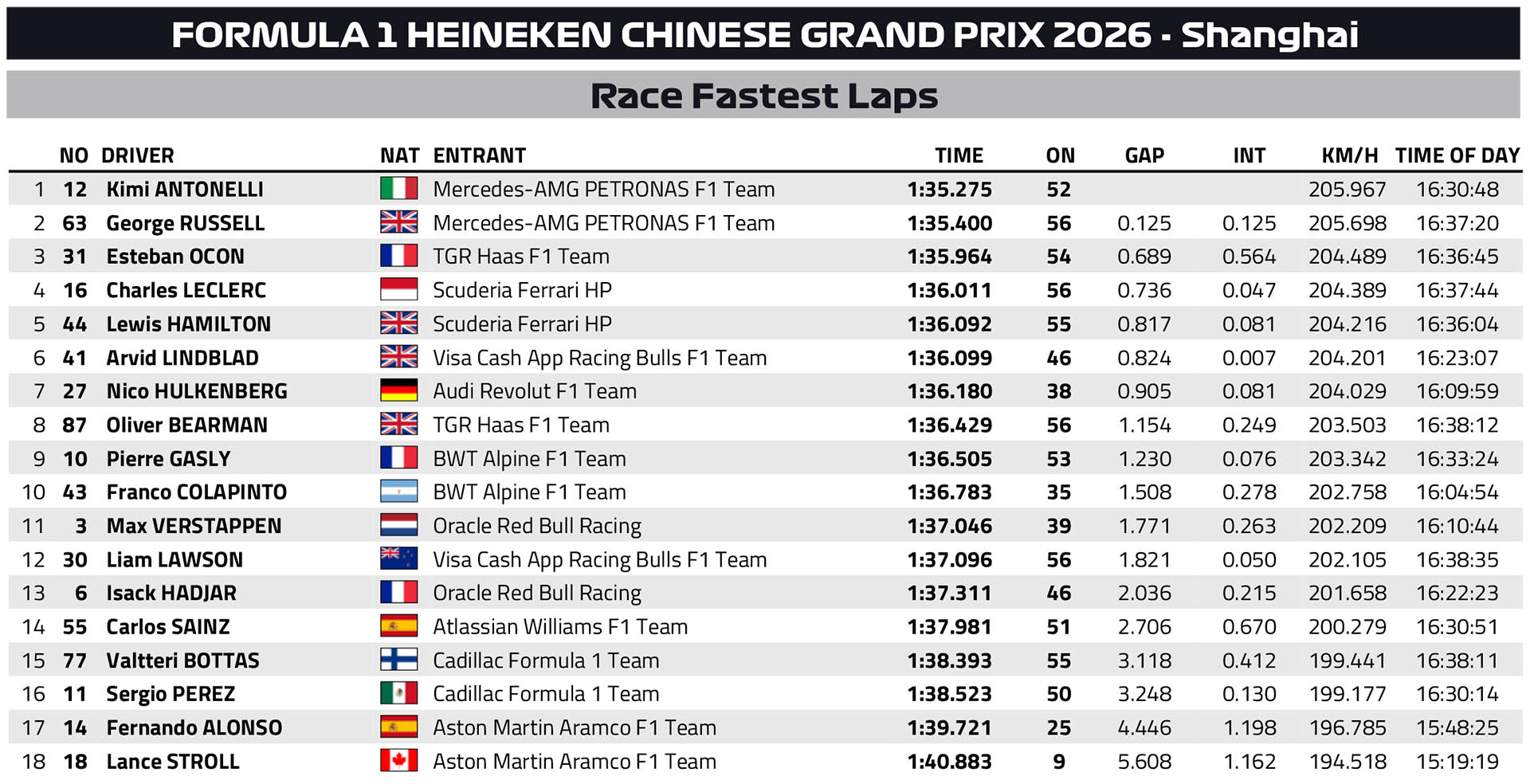 Ο Antonelli έγινε μόλις ο δεύτερος οδηγός στην ιστορία της Formula 1 που έχει κατακτήσει νίκη σε ηλικία κάτω των 20 ετών, έπειτα από τον Max Verstappen. Επίσης, έγινε ο πρώτος νικητής σε Grand Prix έπειτα από 20 χρόνια, από το GP Μαλαισίας του 2006 και τον Giancarlo Fisichella με τη Renault. Eπίσης, ο Antonelli έγινε ο πρώτος οδηγός στην ιστορία της F1 που έχει σημειώσει hat trick (νίκη, pole position, ταχύτερο γύρο).