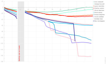Όσοι είχαν εκκινήσει με τη μέση γόμα ελαστικών, εκμεταλλεύτηκαν την ευκαιρία να εισέλθουν στα pits. Ο Antonelli, έχοντας πραγματοποιήσει το pit stop του έχοντας παραμείνει στην πρώτη θέση είχε δύο πιο αργά μονοθέσια πίσω του στην επανεκκίνηση (τους Colapinto και Ocon). Αυτό του έδωσε την ευκαιρία να φέρει πιο προσεκτικά τα ελαστικά του στις ιδανικές θερμοκρασίες τους, τομέας στον οποίο η Mercedes δυσκολευόταν περισσότερο από τη Ferrari.
