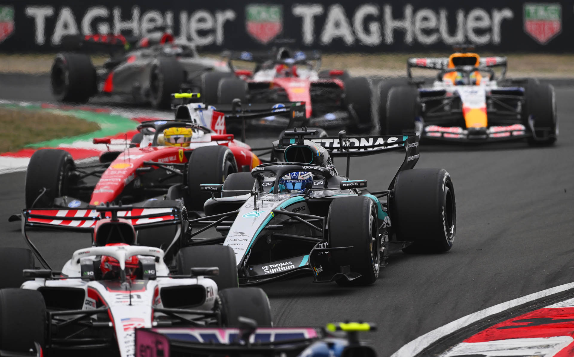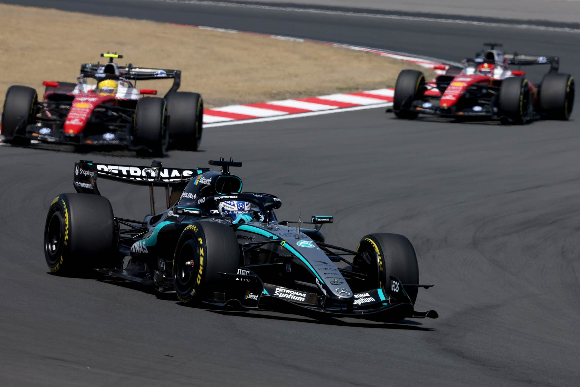 Ο Russell από την πλευρά του, είχε καταφέρει να βρεθεί μπροστά από τις Ferrari έως τον 4ο γύρο, και κατάφερε να επιστρέψει στην πίστα μπροστά τους μετά το pit stop στο αυτοκίνητο ασφαλείας. Ωστόσο, η Mercedes δυσκολεύτηκε πολύ να αναπτύξει τις κατάλληλες θερμοκρασίες στο καινούργιο σετ σκληρής γόμας έπειτα από την επανεκκίνηση, σε αντίθεση με τη Ferrari.