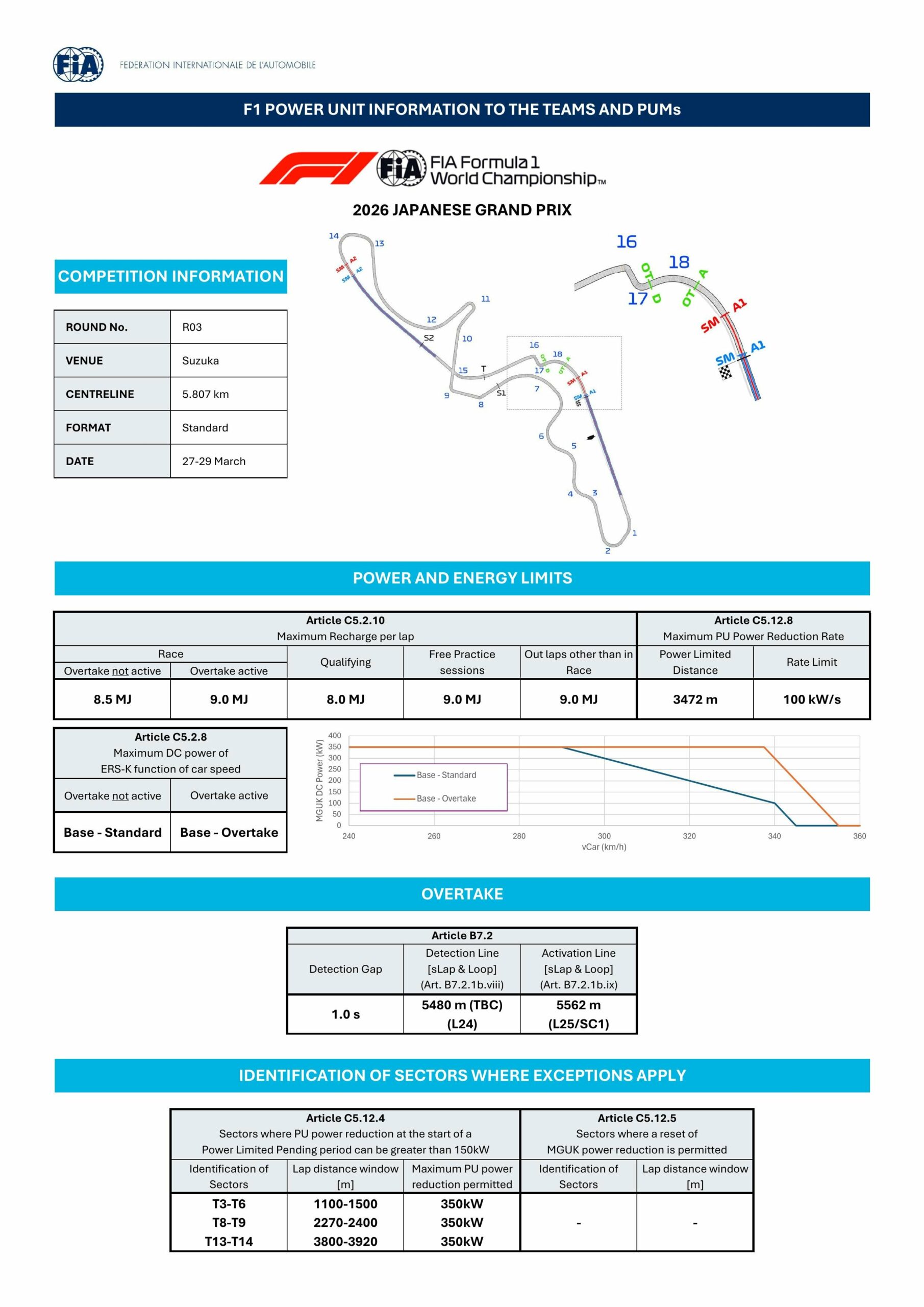 Οι ομάδες και η FIA αποφάσισαν με ομοφωνία να μειώσουν το μέγιστο όριο ανάκτησης ενέργειας στα 8 MJ για τις κατατακτήριες δοκιμές. Στον αγώνα, το μέγιστο όριο θα παραμείνει το μέγιστο, που είναι 8,5 MJ σε έναν κανονικό γύρο και 9 MJ με ενεργοποιημένη τη λειτουργία προσπεράσματος (overtake mode), όταν ο οδηγός βρίσκεται εντός 1 δλ. απόστασης από τον προπορευόμενο στο σημείο ανίχνευσης (ακριβώς μετά το chicane 16/17 στην πίστα της Suzuka).