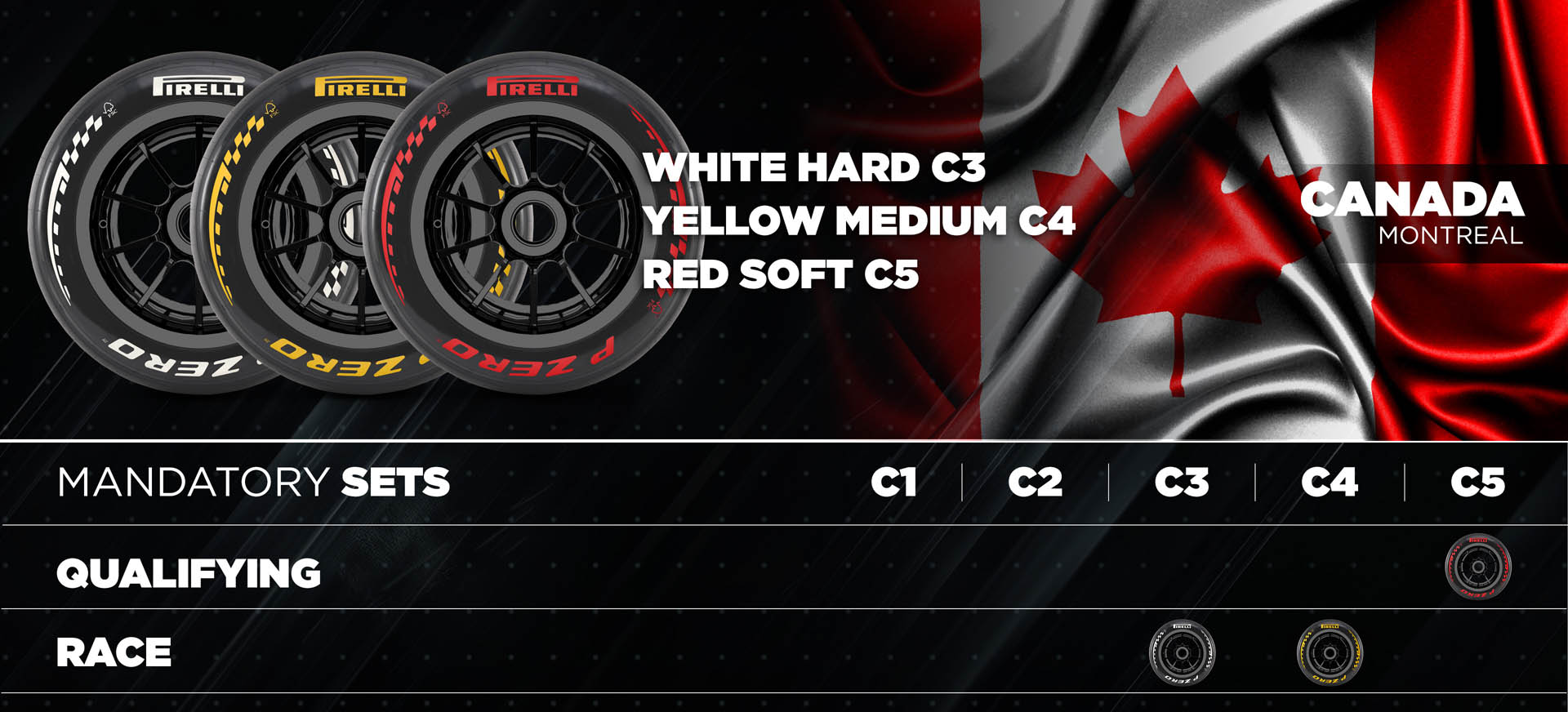 Στο περυσινό GP Καναδά χρησιμοποιήθηκαν οι γόμες C4, C5 και η πιο μαλακή C6. Οι στρατηγικές κινήθηκαν προς τα δύο pit stop με τη χρήση της σκληρής και μέσης γόμας (C4 και C5). Με τον αγώνα να διεξάγεται νωρίτερα φέτος στην πίστα Gilles Villeneuve, στην τεχνητή νήσο Notre-Dame, στην εξίσωση ενδέχεται να εισέλθει και ο παράγοντας των καιρικών συνθηκών.