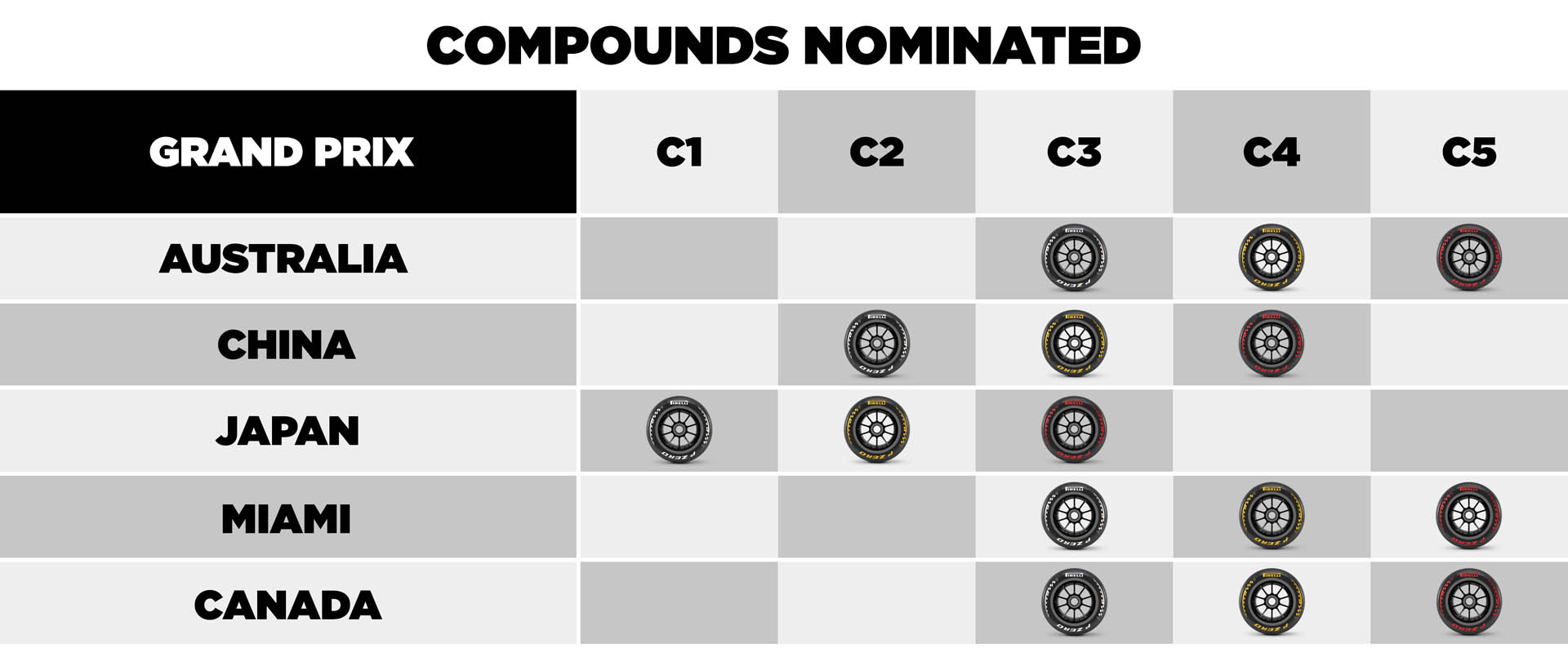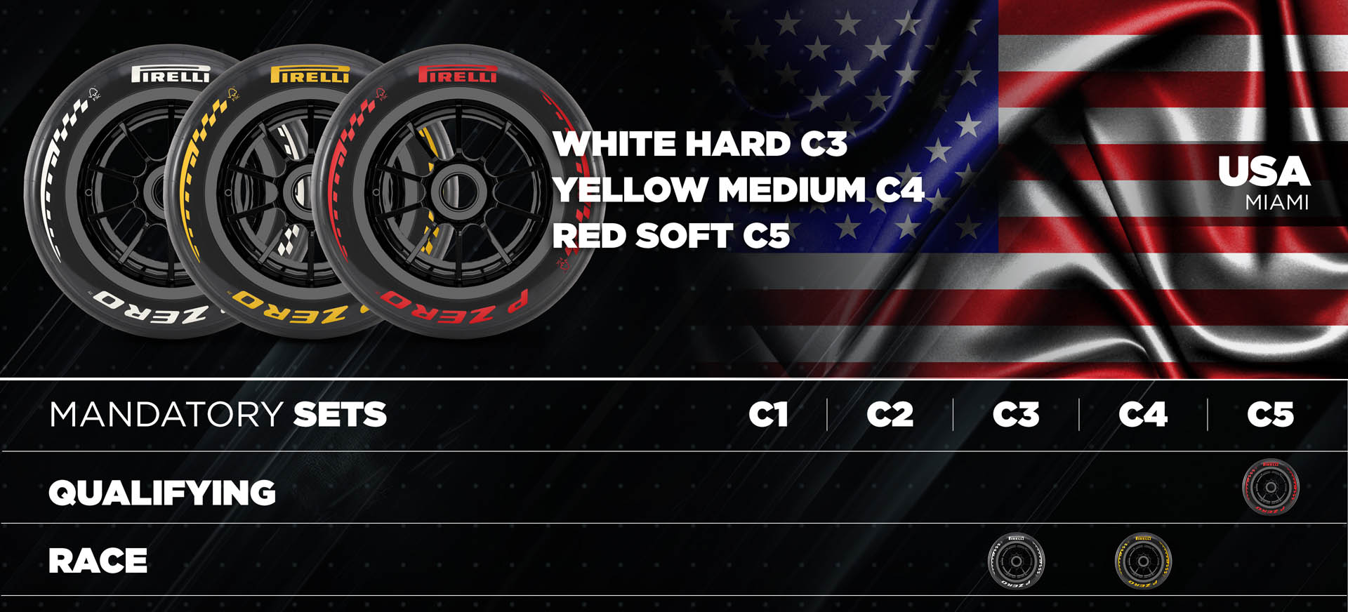 Συγκεκριμένα, η Pirelli θα έχει στη διάθεση των 11 ομάδων του grid τις γόμες C3, C4 και C5 για τα Grand Prix Μαϊάμι (1-3 Μαΐου) και Καναδά (22-24 Μαΐου). Τα χαρακτηριστικά της πίστας που έχει κατασκευαστεί γύρω από το στάδιο των Miami Dolphins, με πολύ λεία άσφαλτο, επιτρέπουν τη χρήση των πιο μαλακών ελαστικών της γκάμας.