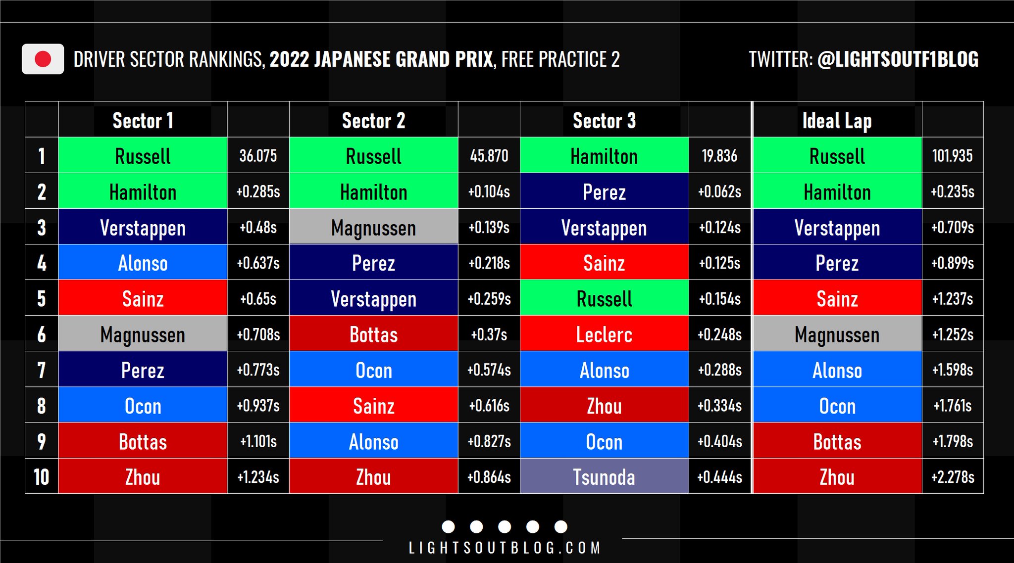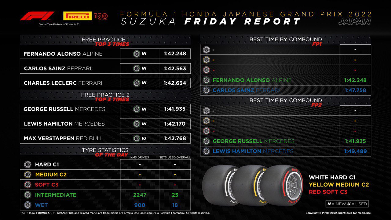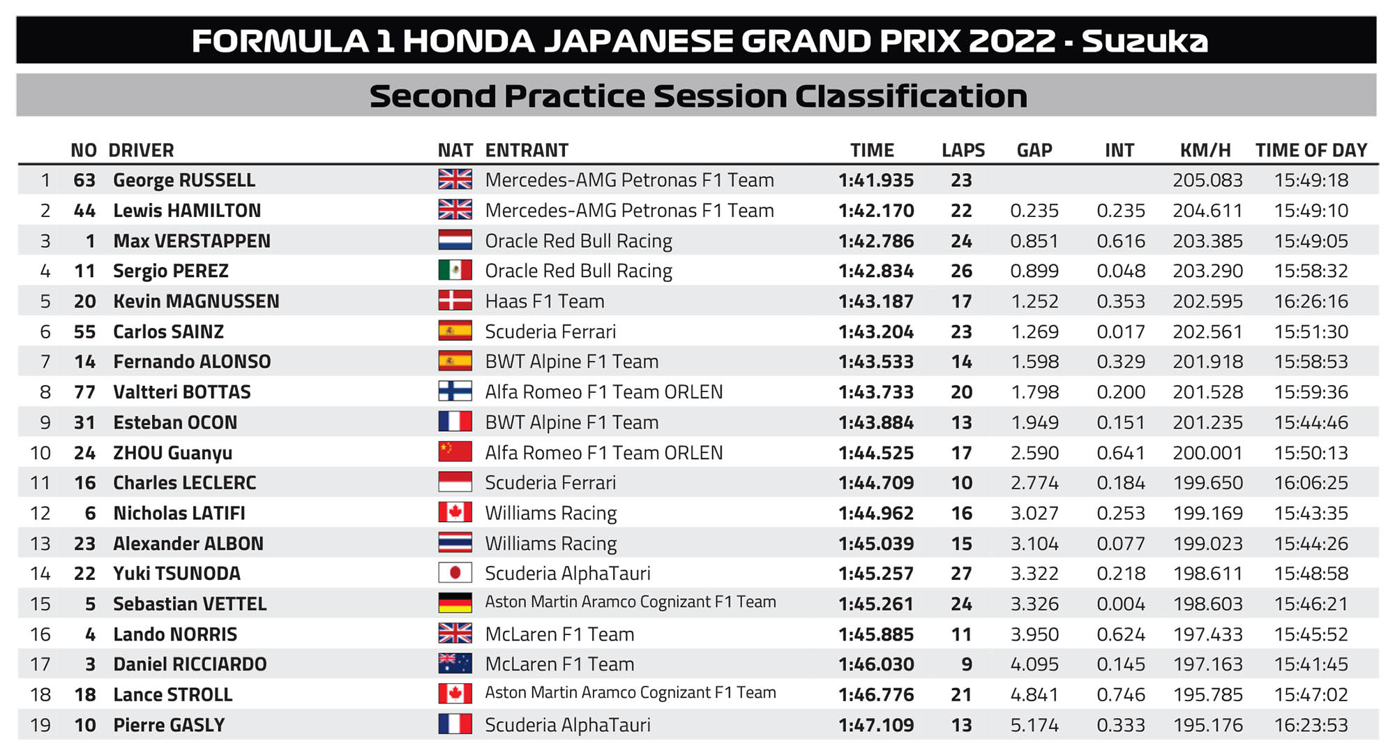 H Mercedes κατάφερε να σημειώσει τους δύο ταχύτερους χρόνους του FP2 του GP Ιαπωνίας, που όπως και το FP1, διεξήχθη σε βρεγμένη πίστα. Ο George Russell κινήθηκε 0,235 δλ. ταχύτερα από τον team-mate του, Lewis Hamilton. Μάλιστα, η διαφορά του Russell από τις δύο Red Bull ξεπερνούσε τα 8 δέκατα του δλ.