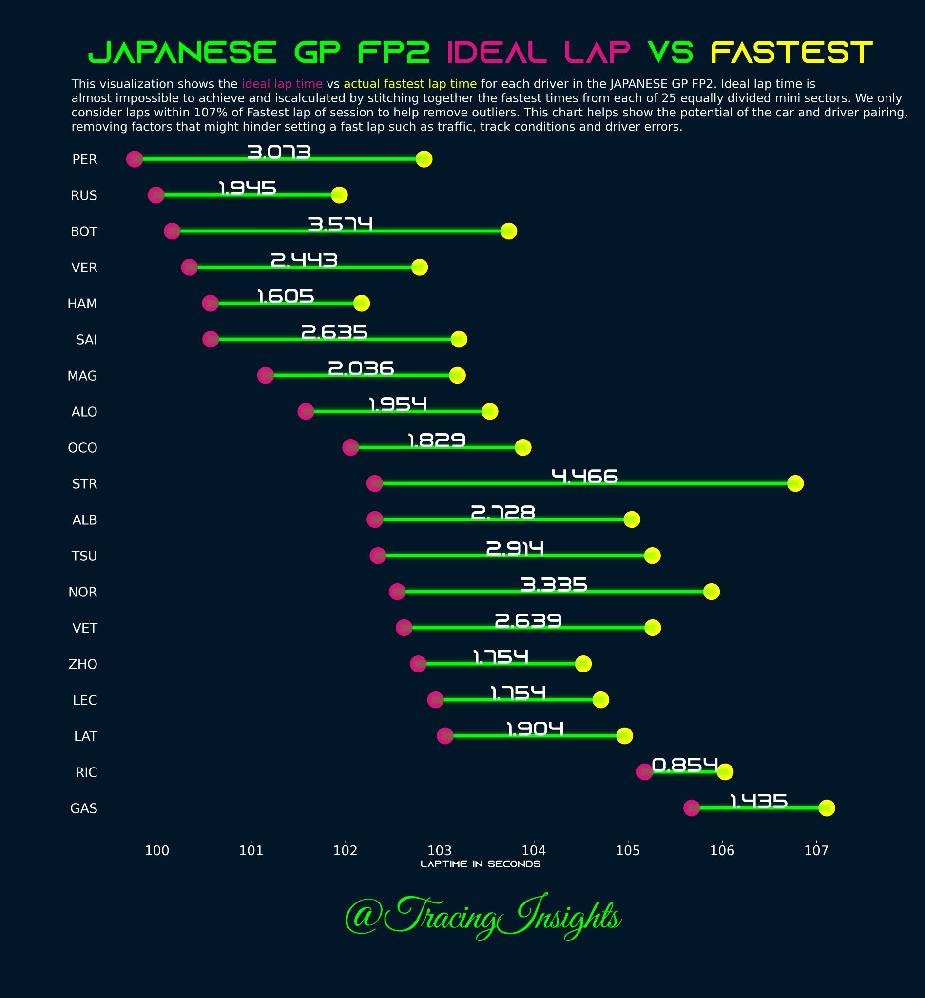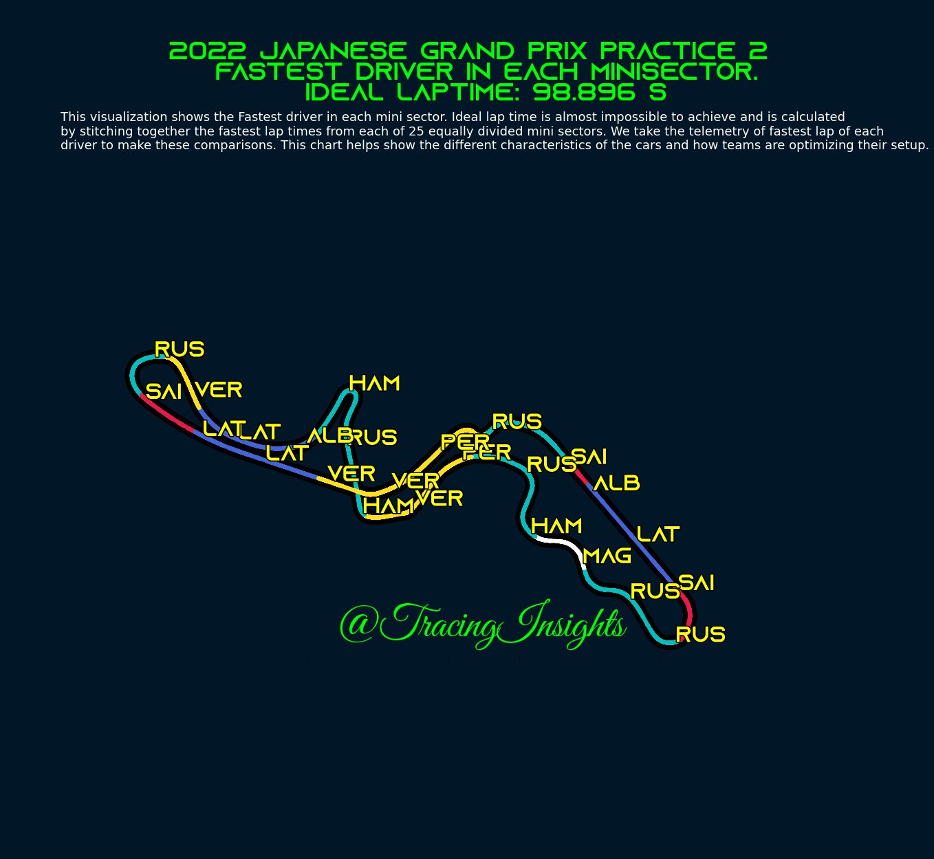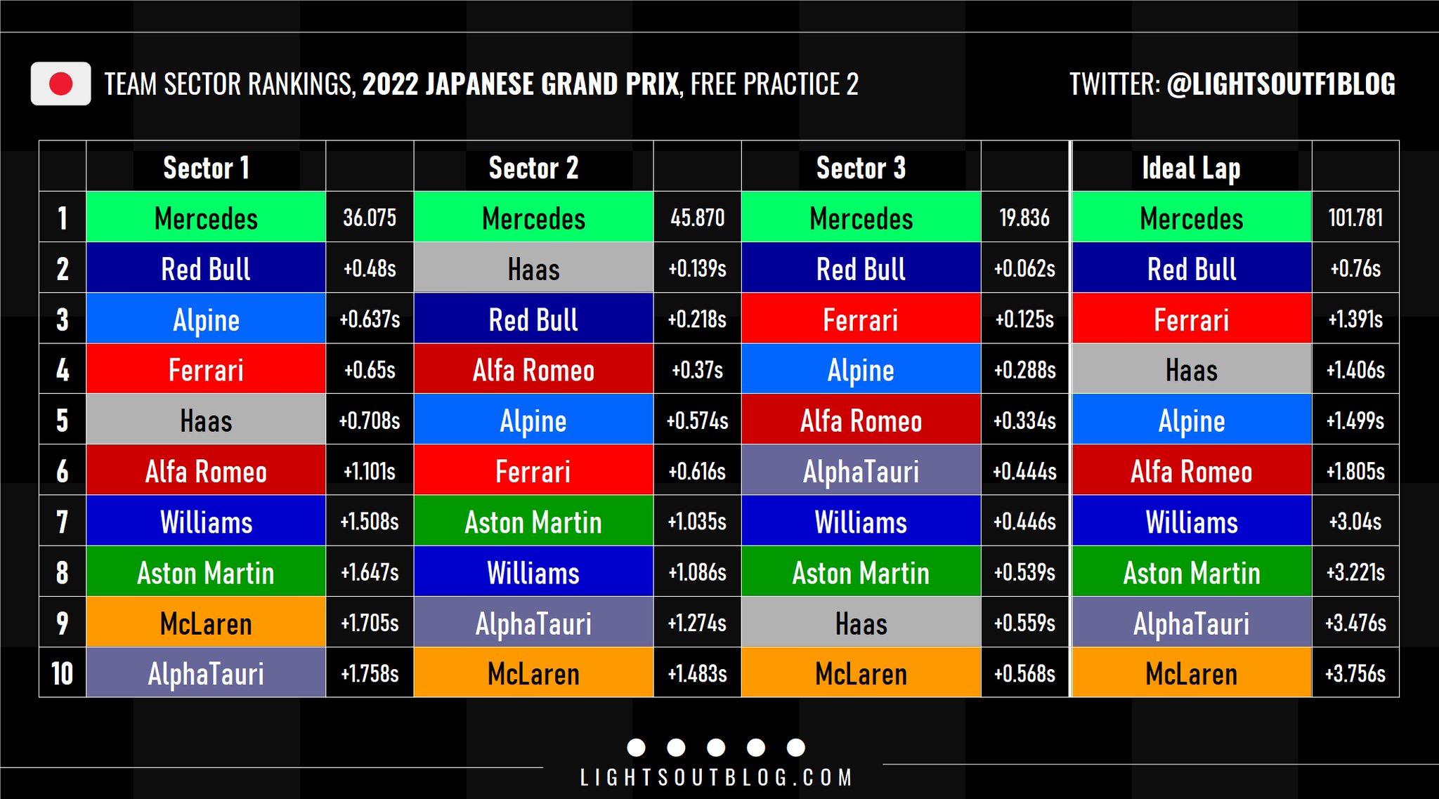 H Mercedes κατάφερε να σημειώσει τους δύο ταχύτερους χρόνους του FP2 του GP Ιαπωνίας, που όπως και το FP1, διεξήχθη σε βρεγμένη πίστα. Ο George Russell κινήθηκε 0,235 δλ. ταχύτερα από τον team-mate του, Lewis Hamilton. Μάλιστα, η διαφορά του Russell από τις δύο Red Bull ξεπερνούσε τα 8 δέκατα του δλ.
