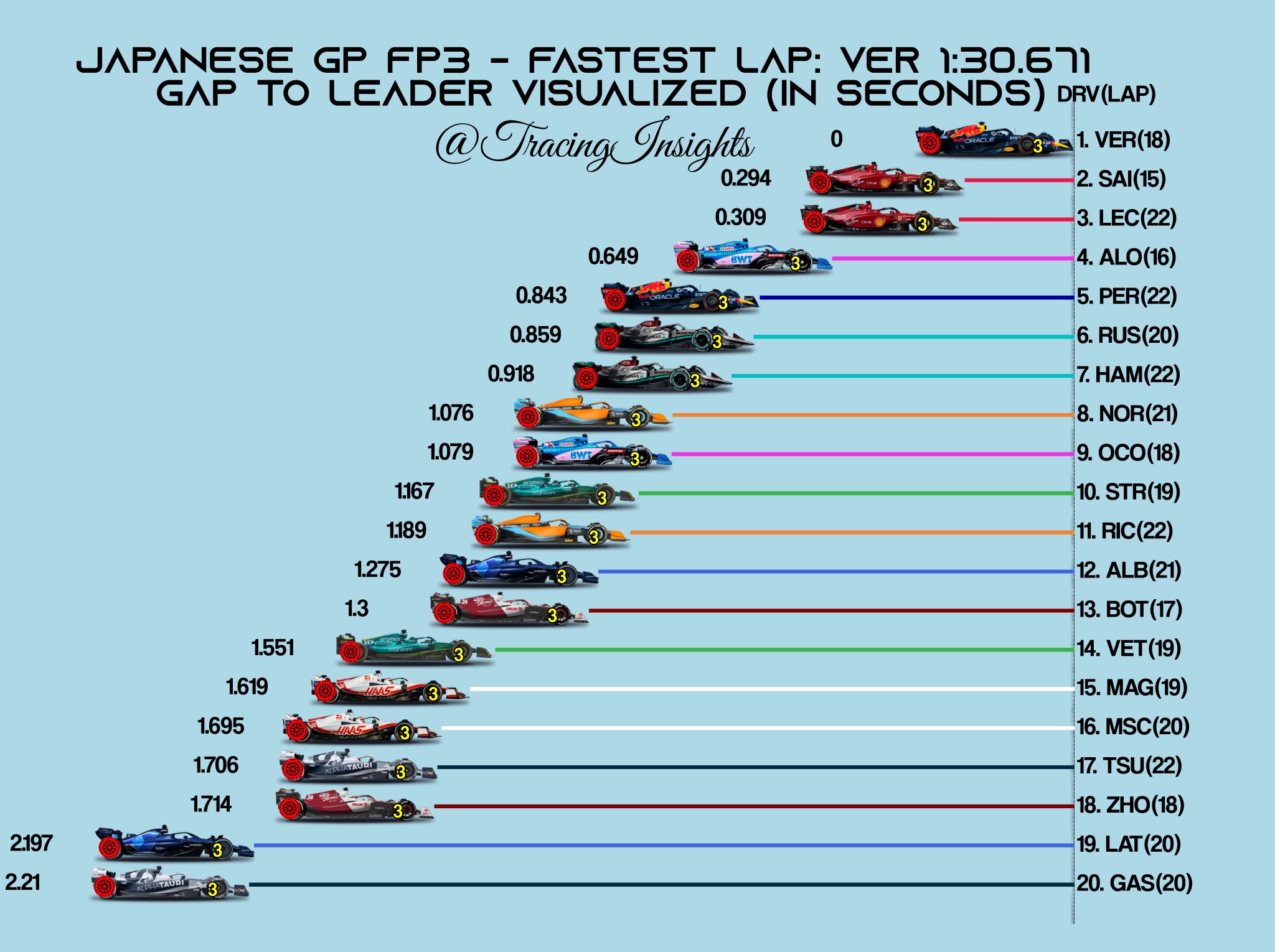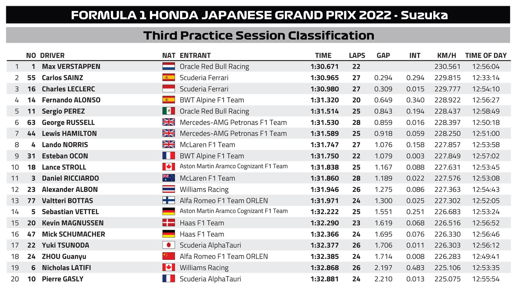 Ο Max Verstappen ήταν ο ταχύτερος οδηγός του FP3 για το GP Ιαπωνίας, σημειώνοντας επίδοση 0,3 δλ. ταχύτερη από αυτήν των δύο οδηγών της Ferrari. Ο Carlos Sainz βρέθηκε στη 2η θέση, εμπρός από τον Charles Leclerc, με διαφορά μόλις 15 χλστ. του δλ. μεταξύ των δύο οδηγών της Scuderia.