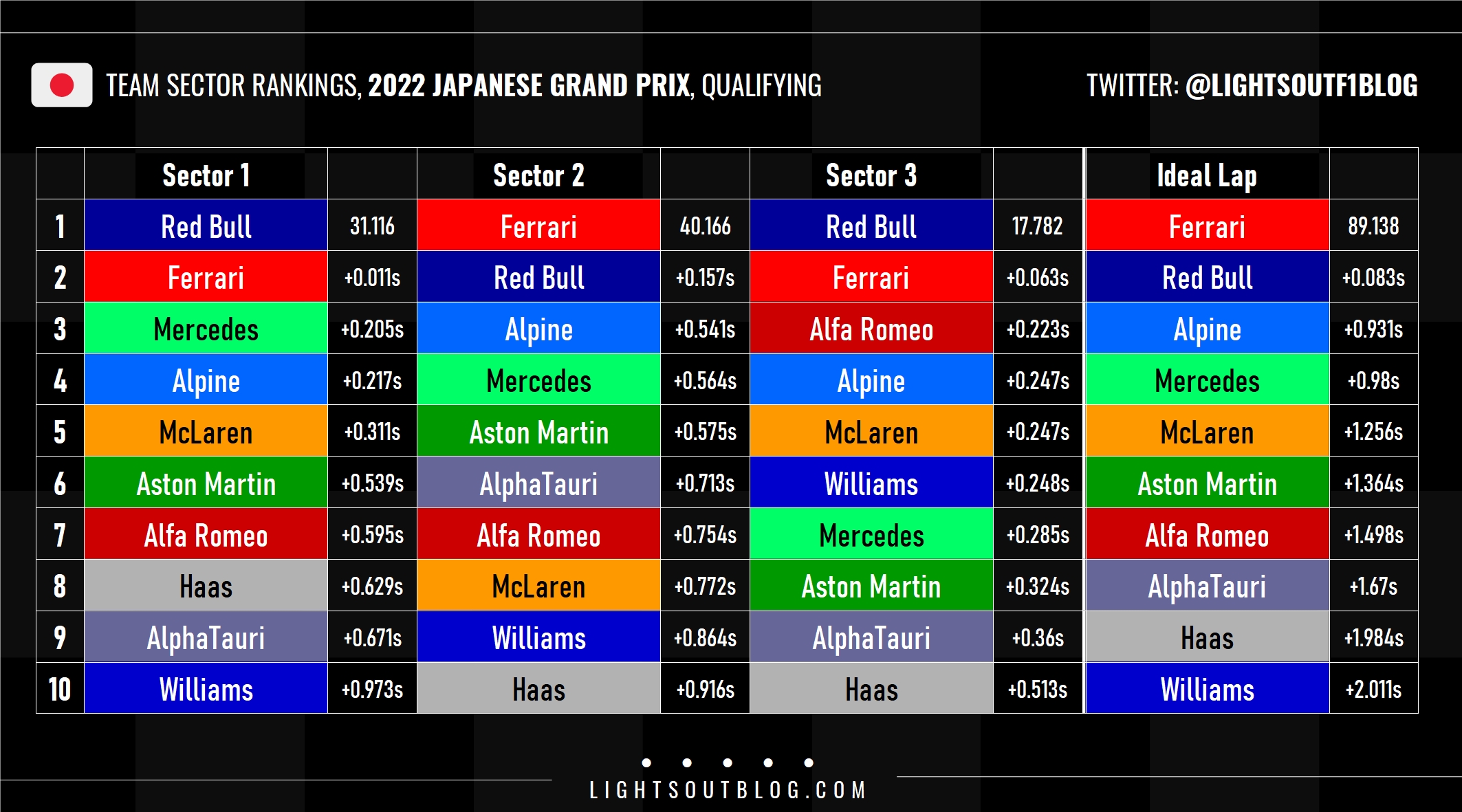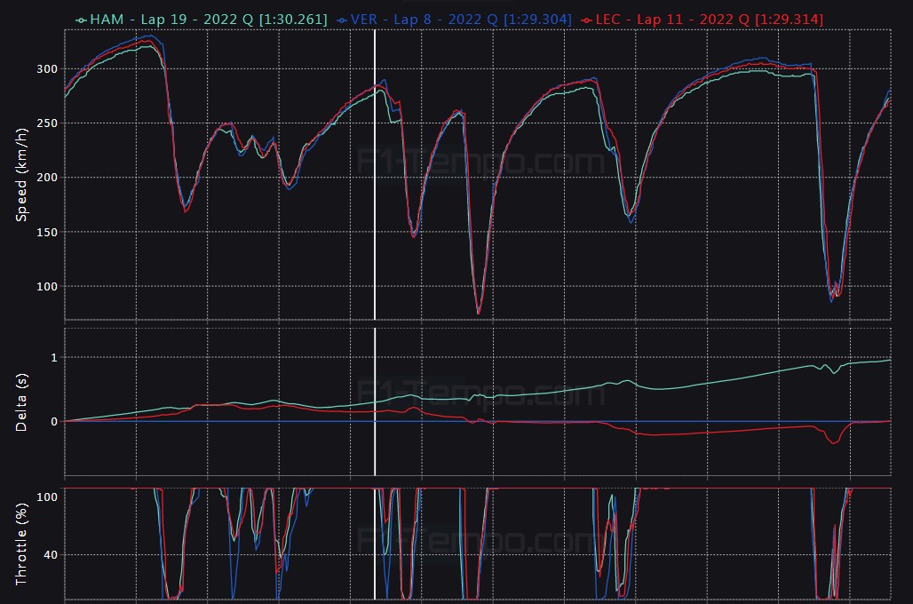 Η Red Bull κέρδιζε χρόνο στις γρήγορες στροφές και αλλαγές κατεύθυνσης του 1ου sector και τις ευθείες του 3ου sector, ενώ η Ferrari ήταν πιο δυνατή στις πιο αργές στροφές του 2ου sector. Ο Sainz ανέφερε ότι έχασε χρόνο στην επιτάχυνση στην έξοδο από το τελευταίο chicane, έχοντας υπερβολικό σπινάρισμα.