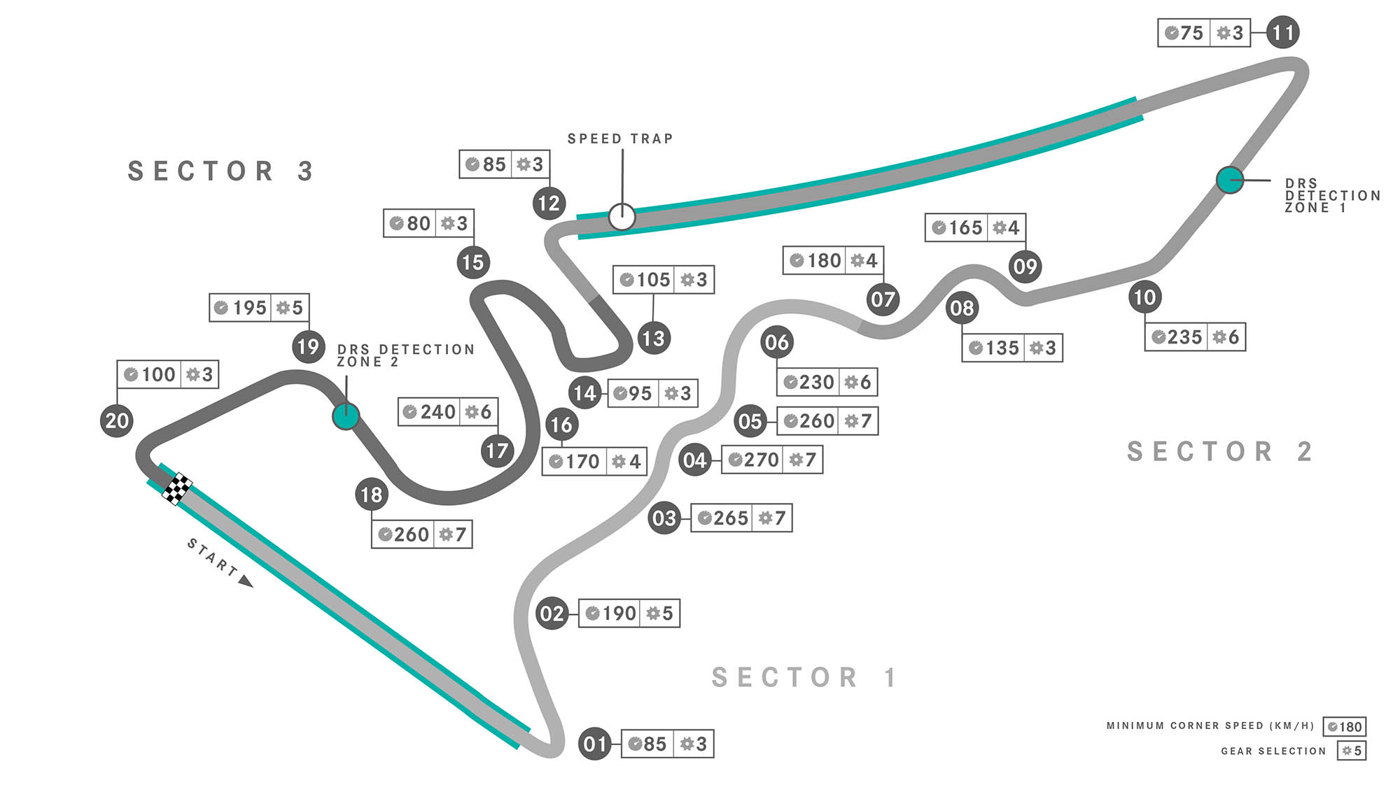 Ζώνες DRS: 2 (μεταξύ των στροφών 11-12 και 20-1)