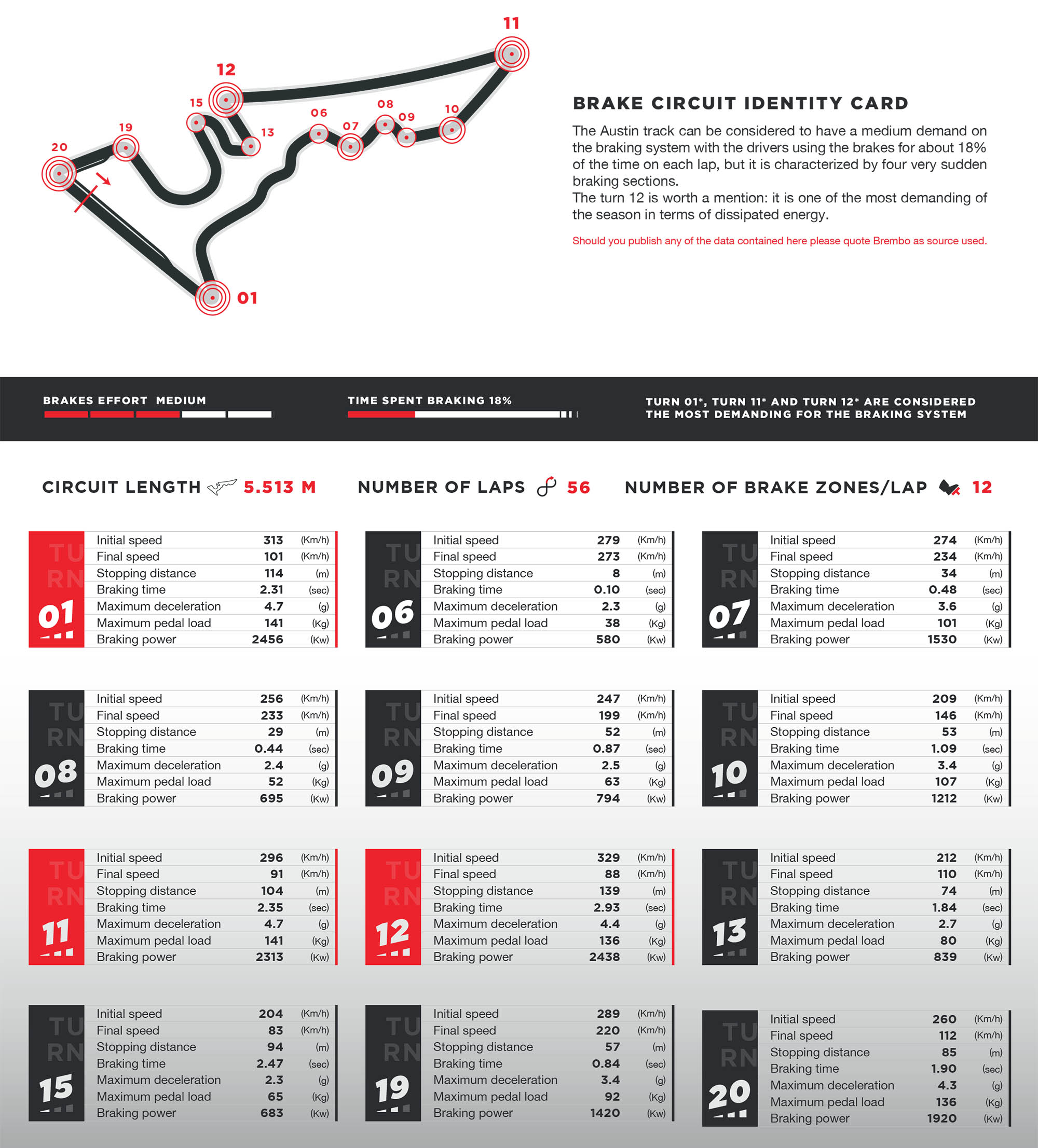 Η ακολουθία στροφών μεταξύ 2-7 διανύεται με μέση ταχύτητα 250 χλμ./ώρα με τα μονοθέσια να στρίβουν συνεχώς για περισσότερα από 800 μέτρα. Πρόκειται για μία από τις μεγαλύτερες σε διάρκεια ακολουθίες στροφών της χρονιάς. Το Austin είναι μία από τις 8 αριστερόστροφες πίστες της χρονιάς. Είναι επίσης η πίστα με τις περισσότερες στροφές (20) έπειτα από τη Jeddah και τη Σιγκαπούρη. Για αυτό και υπάρχουν πολλές αλλαγές σχέσεων (72) κατά τη διάρκεια του γύρου.
