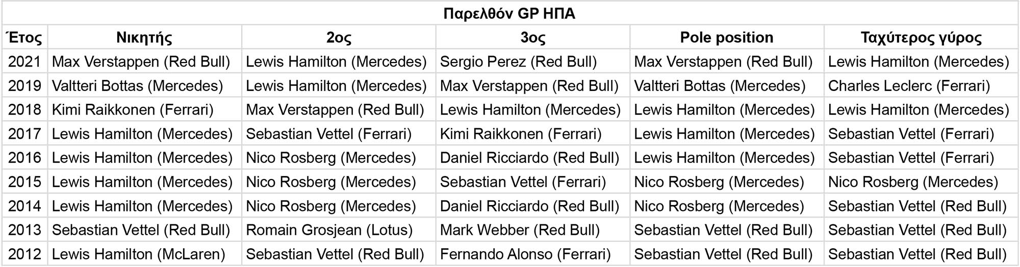 Εάν η Red Bull κατακτήσει τη νίκη στο GP ΗΠΑ θα στεφθεί αυτομάτως Πρωταθλήτρια Κατασκευαστών. Θα πρέπει να εξασφαλίσει προβάδισμα 147 βαθμών έπειτα από τον αγώνα του Austin και αυτή τη στιγμή έχει προβάδισμα 165 βαθμών από τη Ferrari (619-454). Συνεπώς, η Red Bull έχει την πολυτέλεια να σημειώσει 18 βαθμούς λιγότερους από τη Ferrari και να κατακτήσει τον τίτλο.