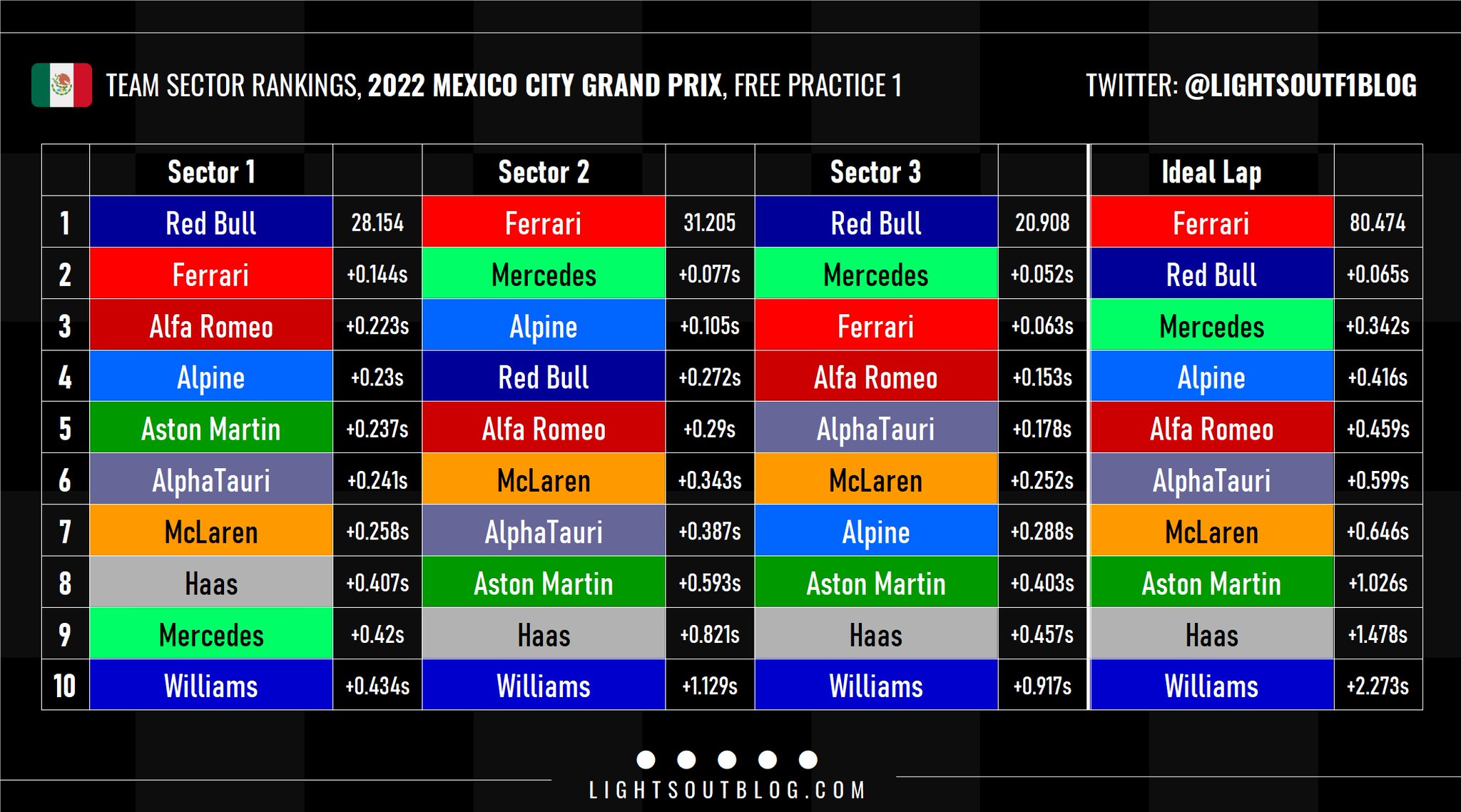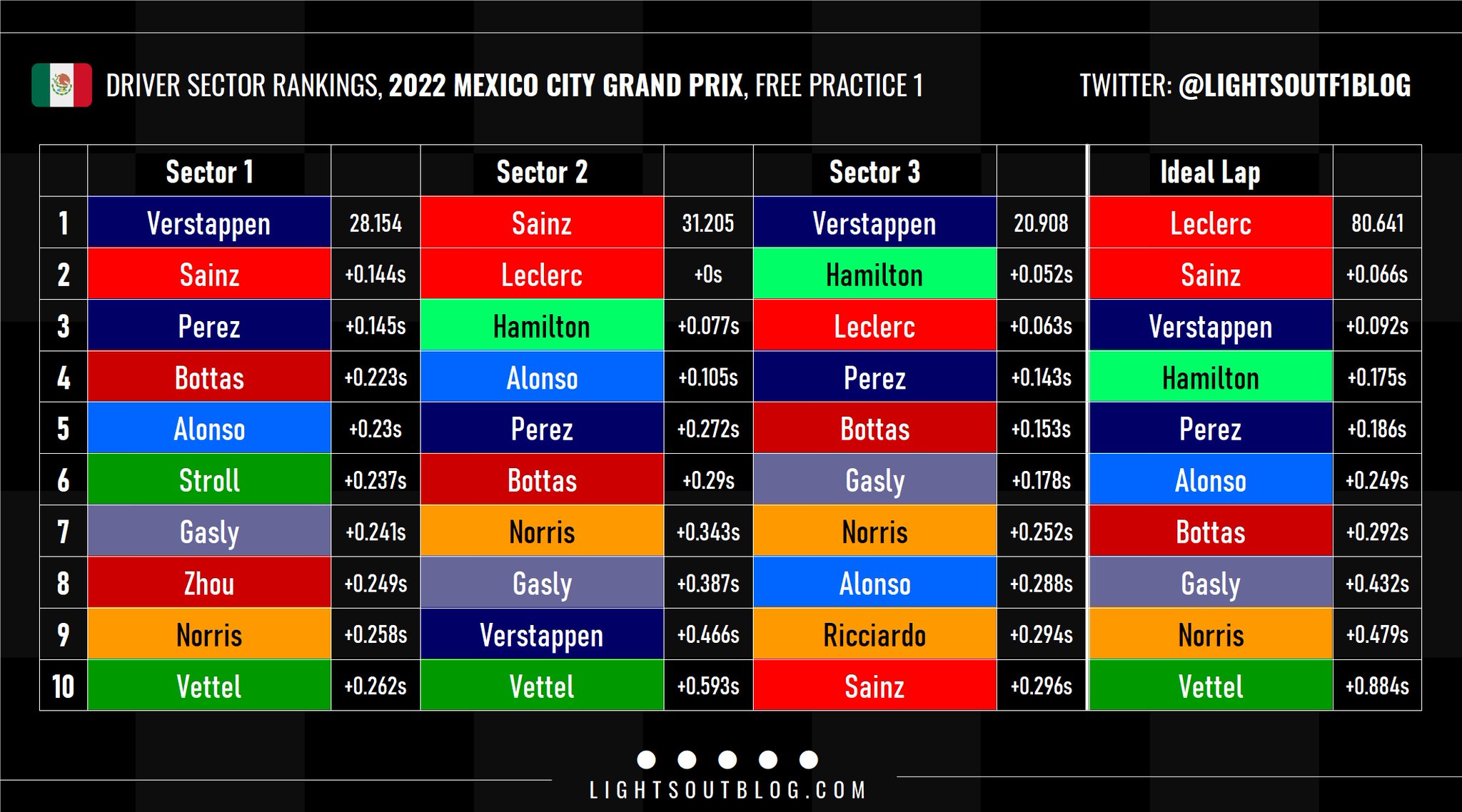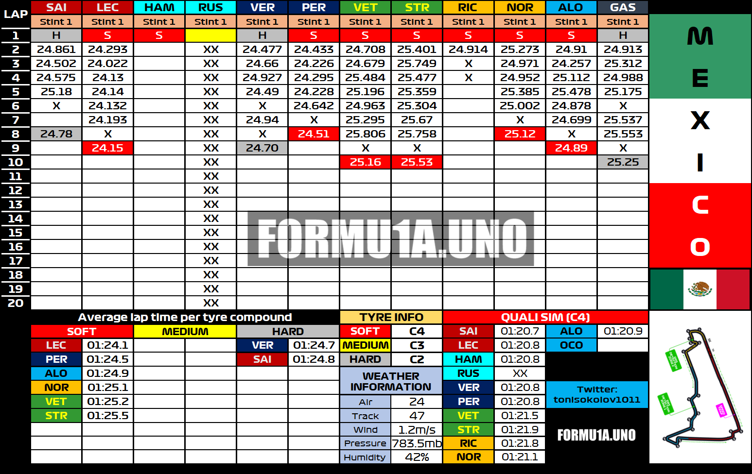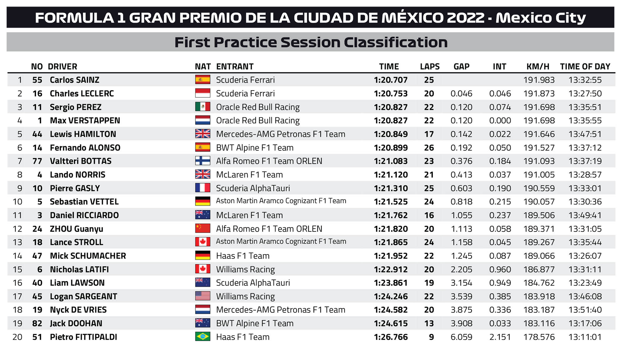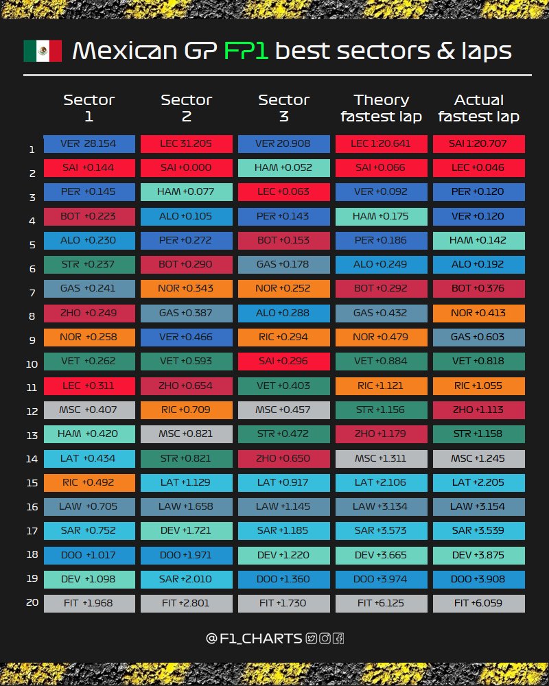 Ο Carlos Sainz σημείωσε τον ταχύτερο χρόνο της πρώτης περιόδους ελεύθερων δοκιμών του GP Μεξικού, με διαφορά μόλις 46 χλστ. του δλ. από τον team-mate του στη Ferrari, Charles Leclerc. O Μονεγάσκος έχασε περίπου 20 λεπτά από τη διαδικασία, καθώς η Ferrari διέγνωσε ότι υπήρχε απώλεια πίεσης σε ένα από τα ελαστικά του πρώτου σετ -σκληρής γόμας- που χρησιμοποίησε. Συνεπώς ο Leclerc ήταν ο πρώτος που τοποθέτησε τα μαλακά ελαστικά στο μονοθέσιό του.