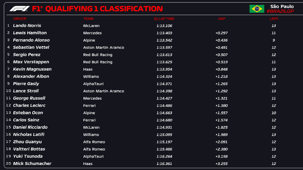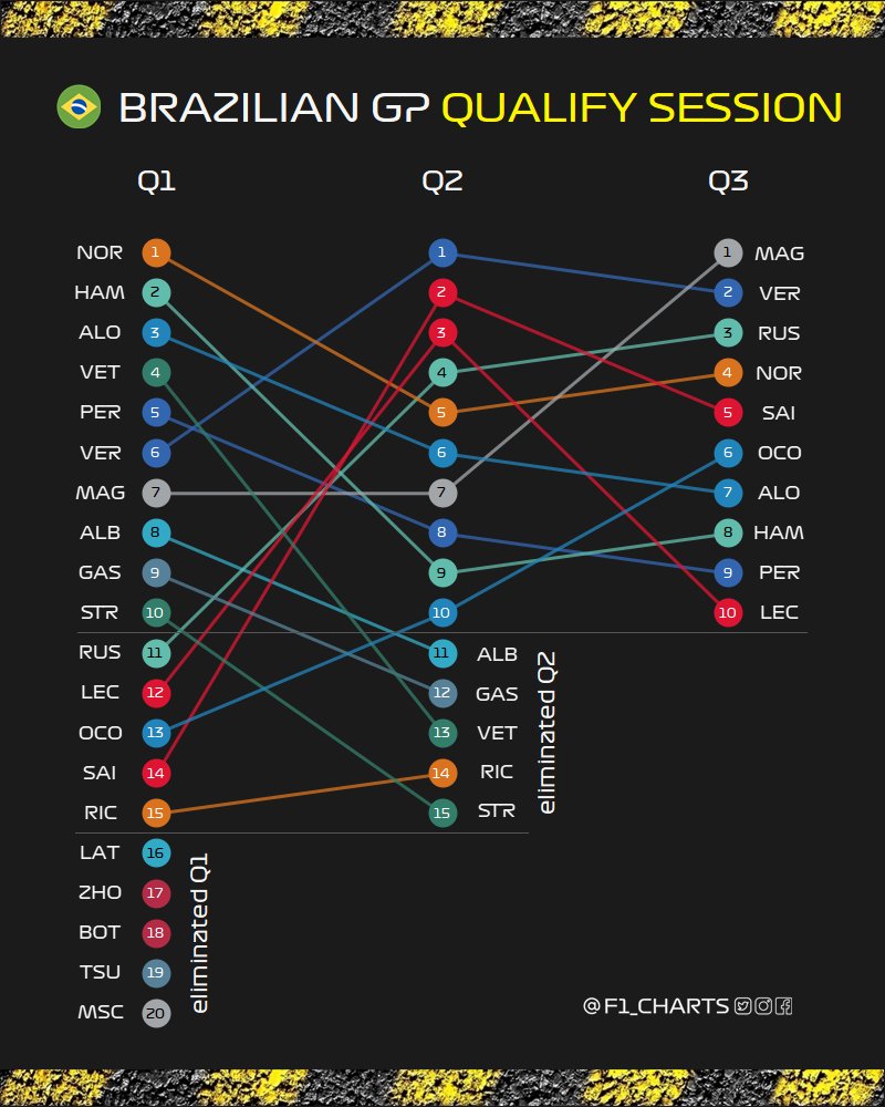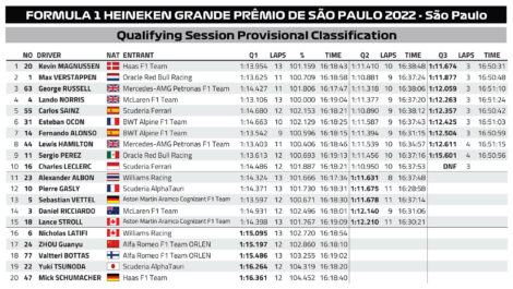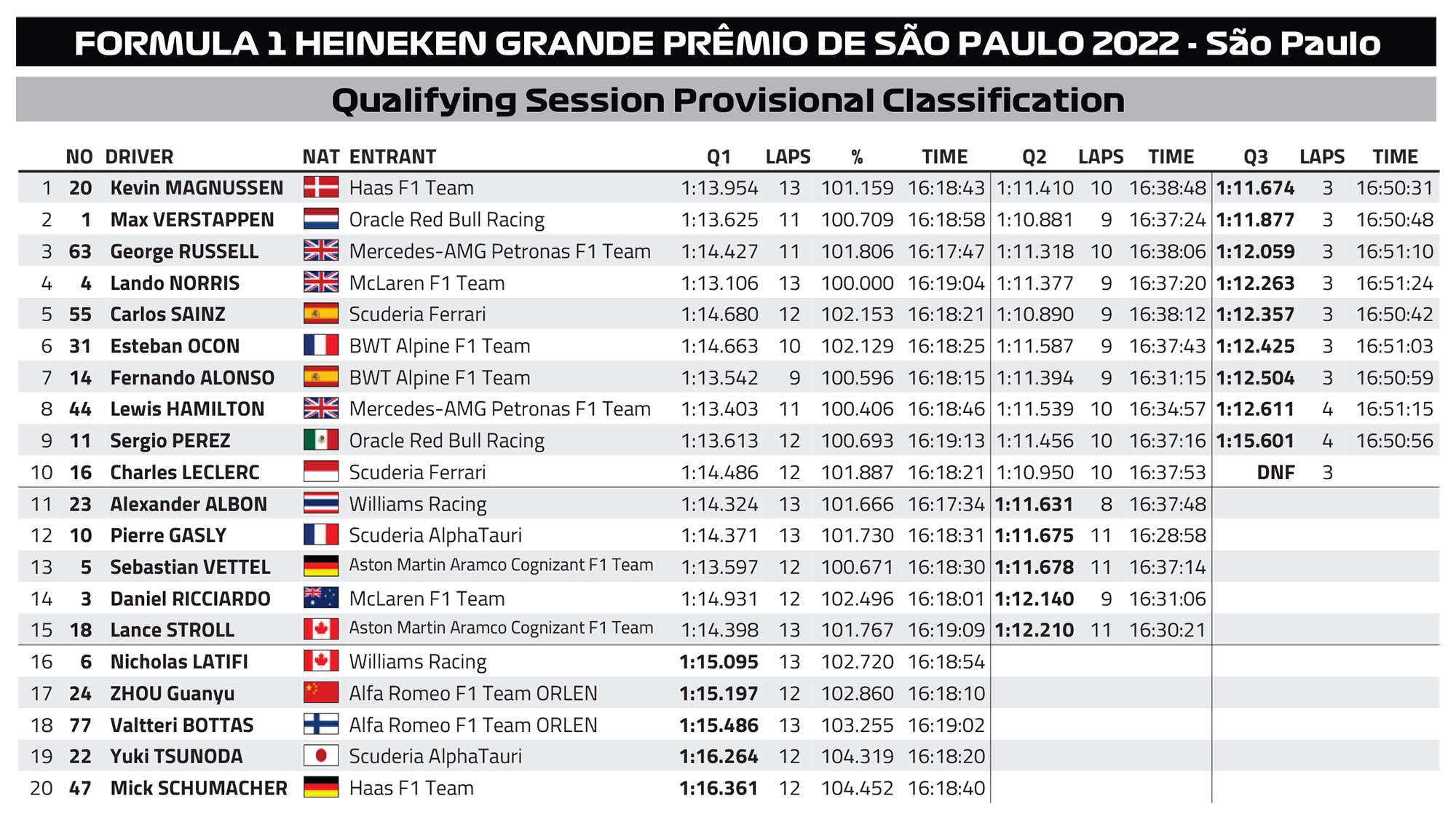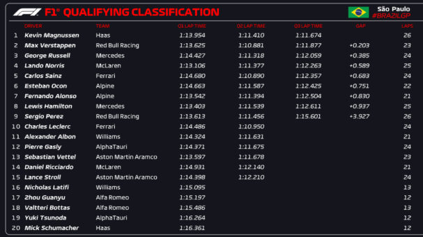 Στη συνέχεια, η βροχή έκανε πολύ πιο αργή την πίστα και αναγκαστική την χρήση ενδιάμεσων ελαστικών, ενώ απενεργοποιήθηκε το DRS. Οπότε ο Magnussen είχε τη δυνατότητα να πανηγυρίσει την pole position πριν καν μηδενίσει η αντίστροφη μέτρηση. Ο Lando Norris, πάντα πολύ καλός σε αυτές τις συνθήκες, παρότι ήταν από τους τελευταίους που βγήκαν στην πίστα βρέθηκε στην 4η θέση, εμπρός από τον Carlos Sainz, με τη Ferrari. Τον Ισπανό ακολουθούν οι δύο Alpine, με τον Esteban Ocon εμπρός από τον Fernando Alonso.