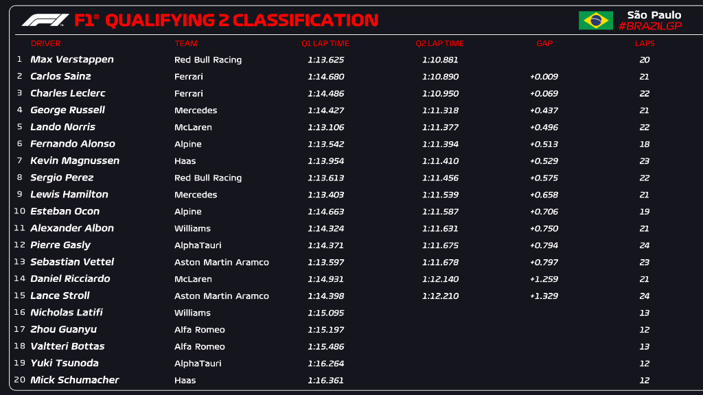 Οι οδηγοί των Red Bull, Ferrari και Mercedes ξεκίνησαν το δεύτερο σκέλος με μεταχειρισμένο σετ μαλακών ελαστικών. Οι οδηγοί της Mercedes δεν είχαν τη δυνατότητα όμως να σημειώσουν αρκετά γρήγορους γύρους για να βρεθούν στην πρώτη δεκάδα. Η γερμανική ομάδα κάλεσε στα pits τους οδηγούς της για ένα καινούργιο σετ μαλακής γόμας, όταν ξεκίνησε να ψιχαλίζει, αλλά πρόλαβαν να κάνουν γρήγορους γύρους.Το ίδιο έκαναν και οι Red Bull και Ferrari, με τον Sainz να βγαίνει από την πεντάδα αποκλεισμού μόλις 2 λεπτά πριν από την ολοκλήρωση του Q2, καθώς οι ψιχάλες υποχώρησαν. Από τη διαδικασία αποκλείστηκε εντέλει ο Alex Albon, που θα εκκινήσει το σπριντ από την 11η θέση, με πίσω του τον Pierre Gasly, τις δύο Aston Martin και τον Daniel Ricciardo.