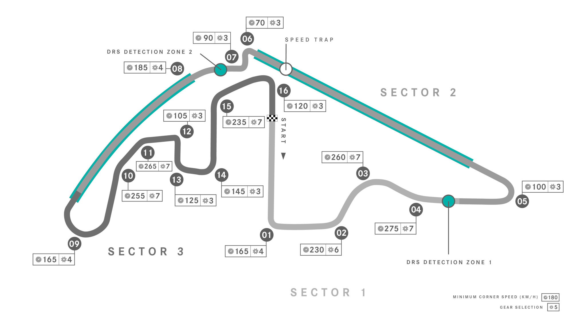 Ζώνες DRS: 2 (μεταξύ των στροφών 5-6 και 8-9)