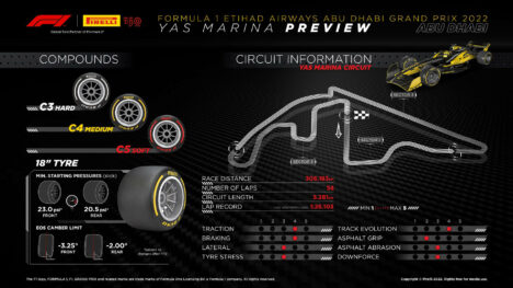 H Pirelli θα φέρει τις πιο μαλακές γόμες στο Άμπου Ντάμπι (C3, C4 και C5), και οι ελάχιστες πιέσεις ελαστικών έχουν διαμορφωθεί στα 23 psi στον εμπρός άξονα και 20,5 psi πίσω, σε θερμοκρασία 70 βαθμών Κελσίου.