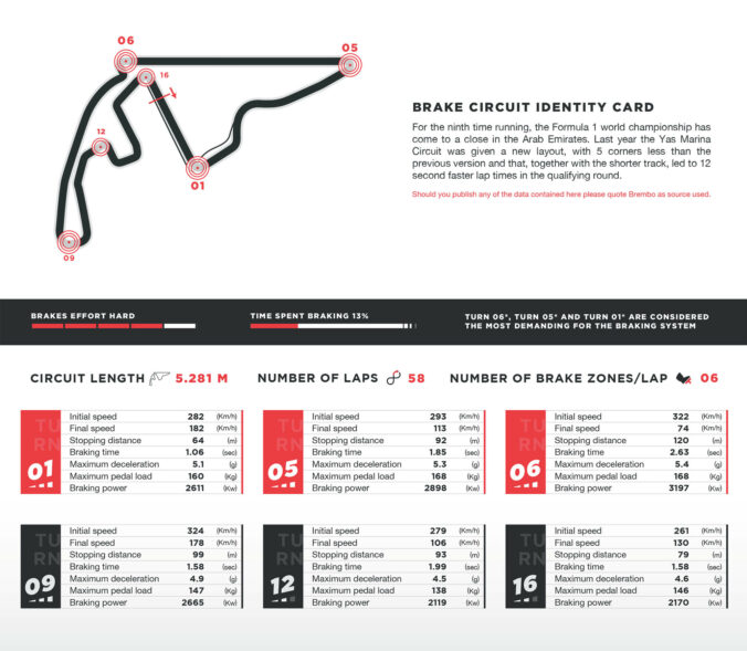 H πίστα της Yas Marina δέχθηκε σημαντικές αλλαγές στη χάραξή της πέρυσι, με αποτέλεσμα να έχει καλύτερη ροή, αλλά έχουν εξαλειφθεί μερικά σημεία που ευνοούσαν τα προσπεράσματα. H Yas Marina έγινε ταχύτερη, με πιο σύντομο χρόνο γύρου, λιγότερες στροφές και επιβαρύνει λιγότερο πλέον τα συστήματα πέδησης. Ένα από τα πιο χαρακτηριστικά στοιχεία της πίστας είναι η ευθεία 1,2 χλμ. μεταξύ των στροφών 5 και 6, και στο τέλος της γίνονται αρκετά προσπεράσματα.