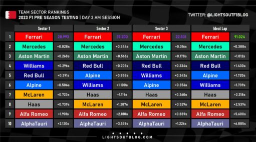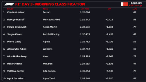 Δεν είναι γνωστό αν ο Lance Stroll θα συμμετάσχει στο GP Μπαχρέιν. Θα επισκεφθεί τον προσομοιωτή της Aston Martin για να διαπιστωθεί αν έχει αναρρώσει πλήρως και αναφέρεται ότι επισκέφθηκε τον παγκοσμίου φήμης Ισπανό ορθοπεδικό χειρούργο Xavier Mir, ο οποίος έχει ασχοληθεί και με αναβάτες του MotoGP. Ο Felipe Drugovich σημείωσε σήμερα τον 3ο χρόνο.
