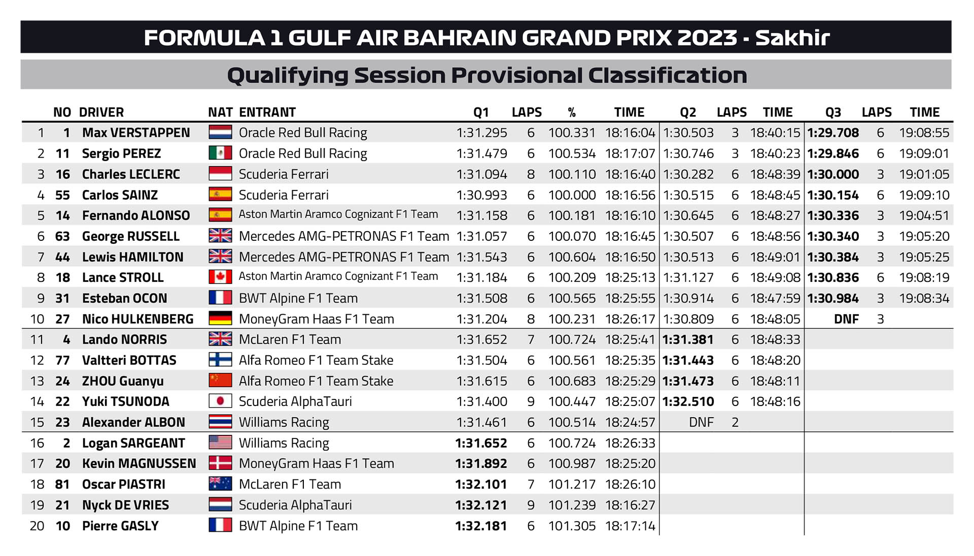 Ο Max Verstappen κατέκτησε την 21η του pole position στη Formula 1 στον πρώτο αγώνα της σεζόν του 2023, για το GP Μπαχρέιν, έναν αγώνα που ο Ολλανδός δεν έχει κατακτήσει τη νίκη. Ο Verstappen έδειξε τον πραγματικό του ρυθμό από το Q2 και μετά, και κατάφερε να κατακτήσει την pole position. Ο Sergio Perez κατέληξε 138 χλστ. του δλ. πίσω του, για να κλειδώσει την πρώτη σειρά εκκίνησης για της Red Bull στον αυριανό αγώνα.