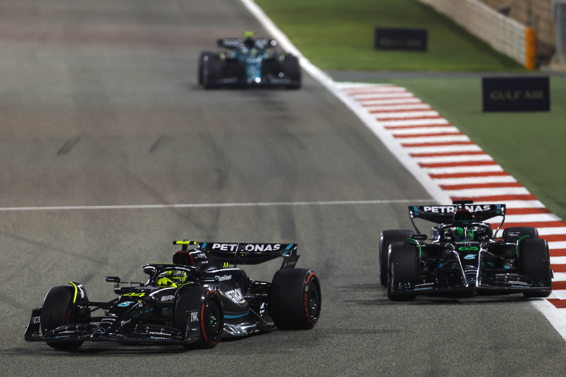 Ο Verstappen κατάφερε να απομακρυνθεί άμεσα, έχοντας χτίσει διαφορά 6 δλ. έως τον 9ο γύρο. Ο Russell ρώτησε στον ασύρματο αν ο Hamilton μπροστά του διαχειριζόταν τα ελαστικά του για αυτό πήγαινε τόσο αργά και η απάντηση ήταν ότι δυσκολευόταν. Ο Russell βγήκε εκτός πίστας στα φρένα για την 10 και αυτό επέτρεψε στον Alonso να πλησιάσει τις Mercedes, οι οποίες είχαν αρχίσει να χάνουν επαφή με τους πρώτους.