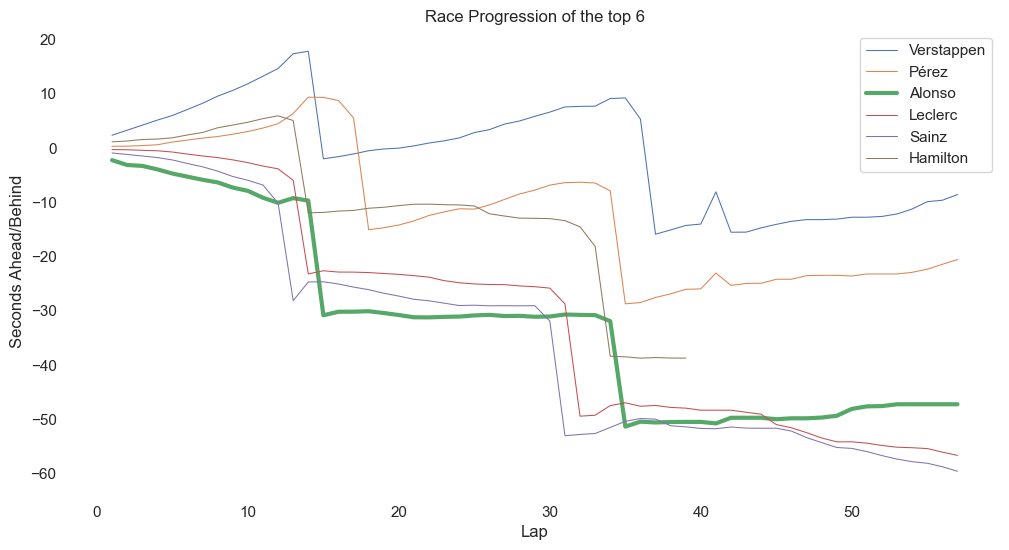 O Ισπανός οδηγός της Ferrari κατάφερε να διατηρήσει την 4η θέση, καθώς κράτησε πίσω του έως την καρό σημαία τον Lewis Hamilton με τη Mercedes. O Lance Stroll, με την άλλη Aston Martin, παρά τους τραυματισμούς του, τερμάτισε στην 6η θέση και παρά τους τραυματισμούς του διατήρησε πίσω του τον George Russell με τη δεύτερη Mercedes. O Valtteri Bottas είδε την καρό σημαία στην 8η θέση, εμπρός από τον Pierre Gasly, με την Alpine να έχει εκμεταλλευτεί με πολύ καλό τρόπο το εικονικό αυτοκίνητο ασφαλείας, για να φέρει το Γάλλο που είχε εκκινήσει τελευταίος στους βαθμούς.