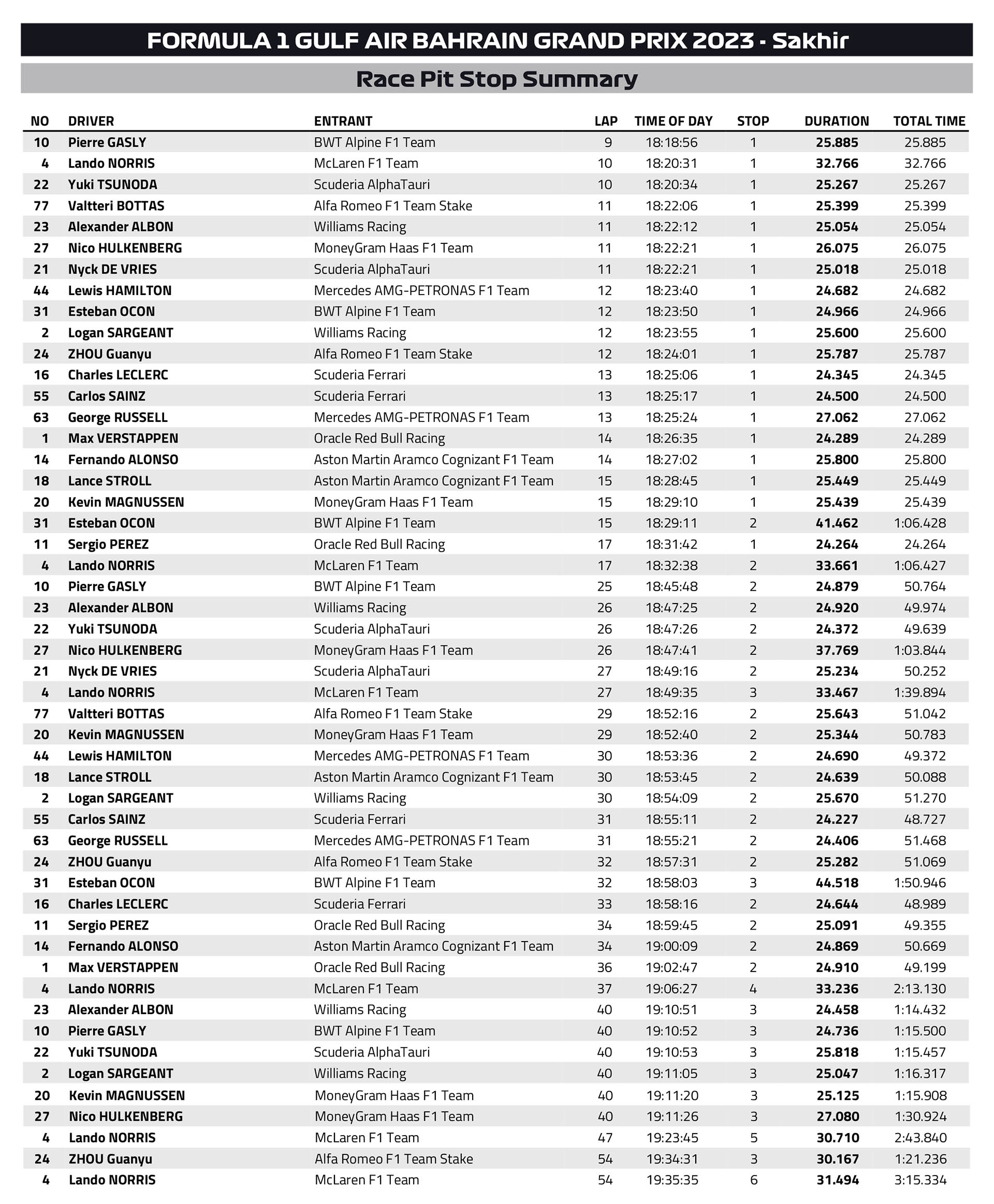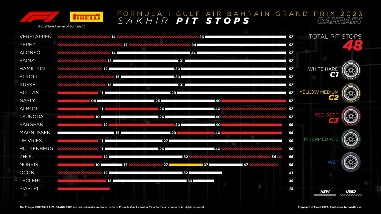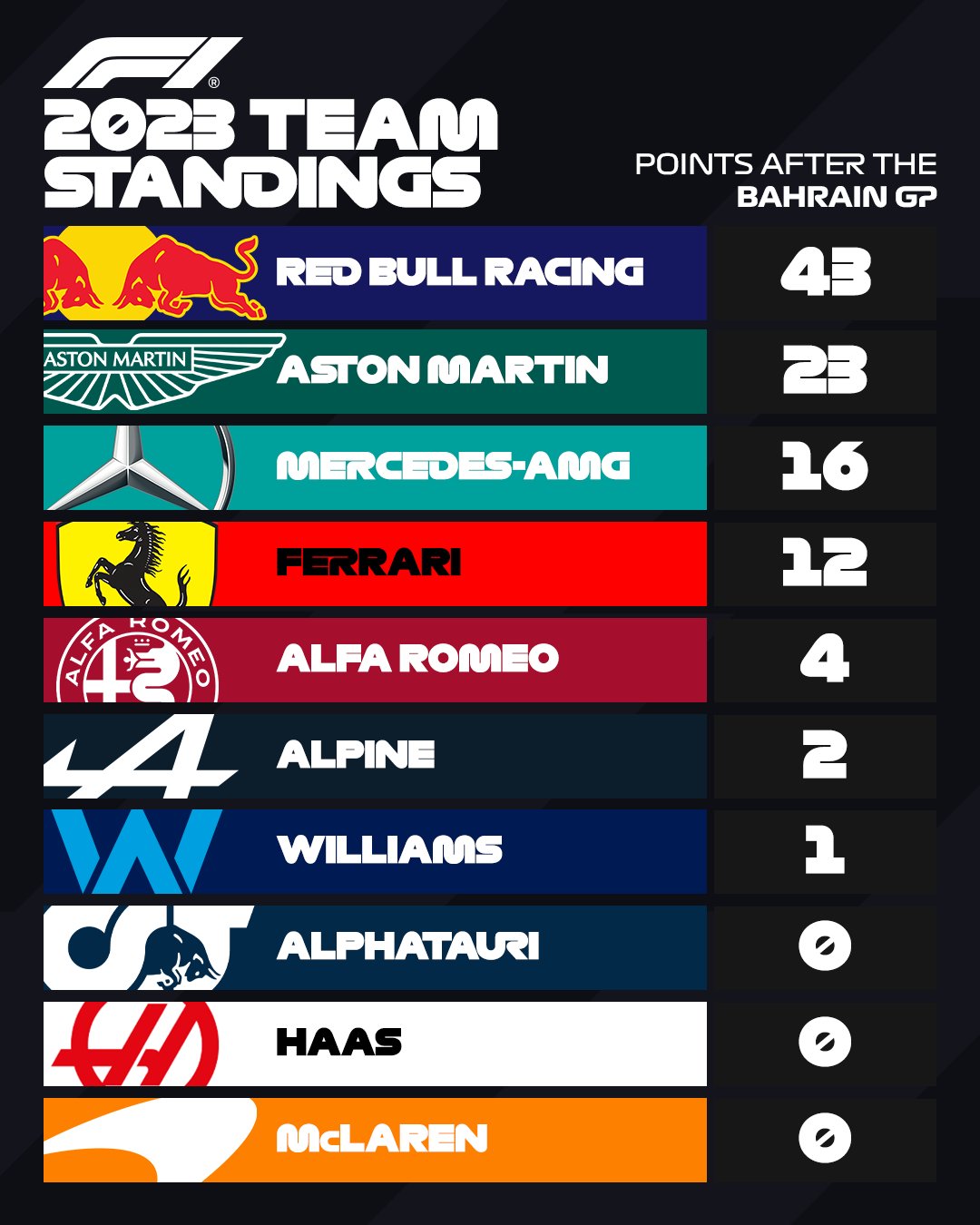 Η Red Bull κατάφερε να σημειώσει το «1-2» χωρίς ιδιαίτερη δυσκολία στον εναρκτήριο αγώνα του 2023, το GP Μπαχρέιν, με τον Max Verstappen να μην έχει απειληθεί σε κανένα στάδιο του αγώνα. O Ολλανδός πήρε την πρώτη του νίκη στο Μπαχρέιν, και την πρώτη της Red Bull σε αυτή την πίστα έπειτα από 10 χρόνια.