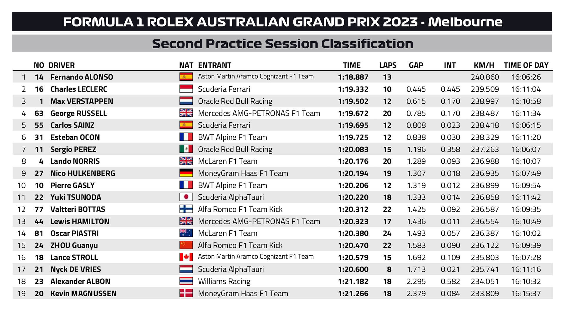 Για μόλις 12 λεπτά παρέμεινε στεγνή η πίστα του Albert Park στη δεύτερη περίοδο ελεύθερων δοκιμών του GP Αυστραλίας, αλλά και πάλι η διαδικασία είχε λιγότερα συμβάντα από το επεισοδιακό FP1. Σε αυτά τα λίγα λεπτά, ο Fernando Alonso με την Aston Martin «πρόλαβε» να σημειώσει την ταχύτερη επίδοση, όντας 445 χλστ. του δλ. ταχύτερος από τη Ferrari του Charles Leclerc. Στην 3η θέση βρέθηκε ο Max Verstappen, ο οποίος βρέθηκε εκτός πίστας στην 1η στροφή λίγο πριν την έλευση της βροχής.
