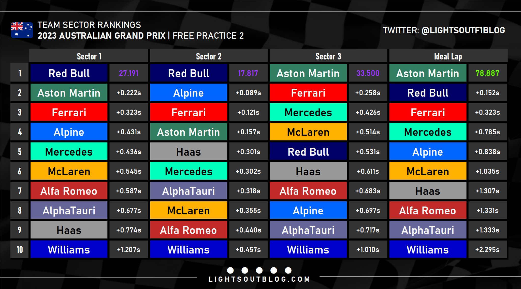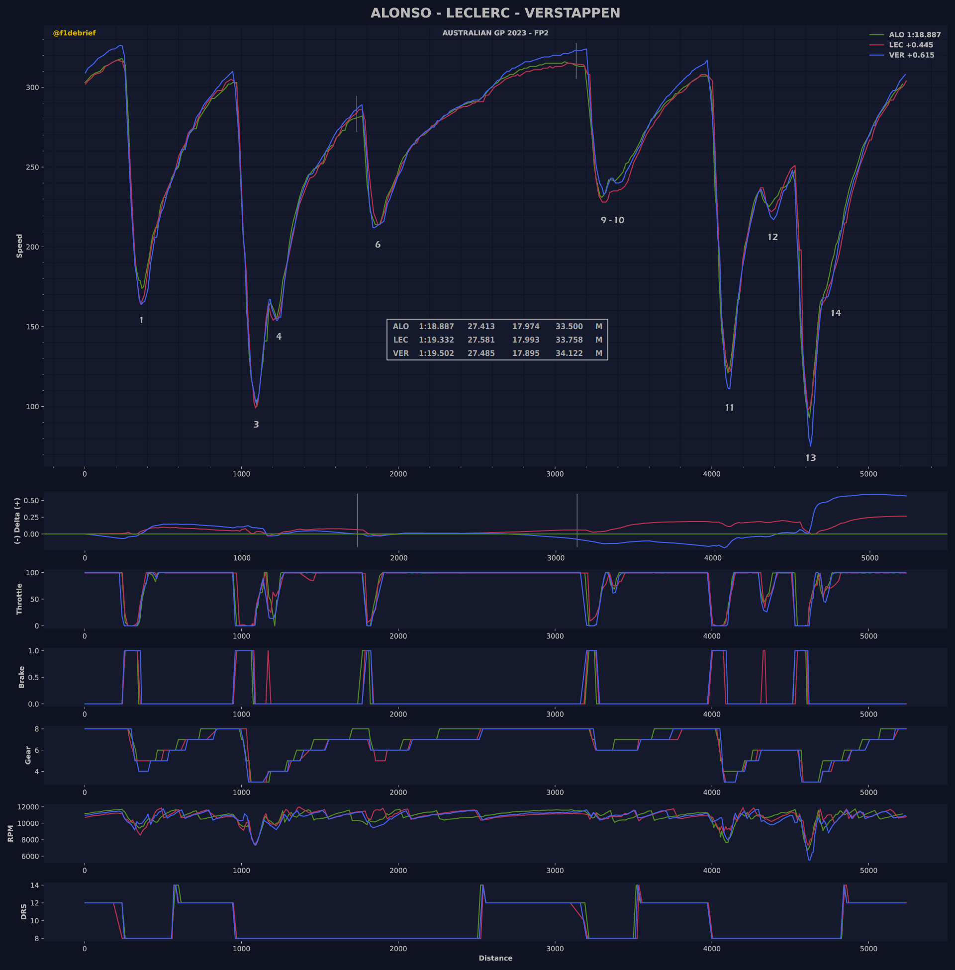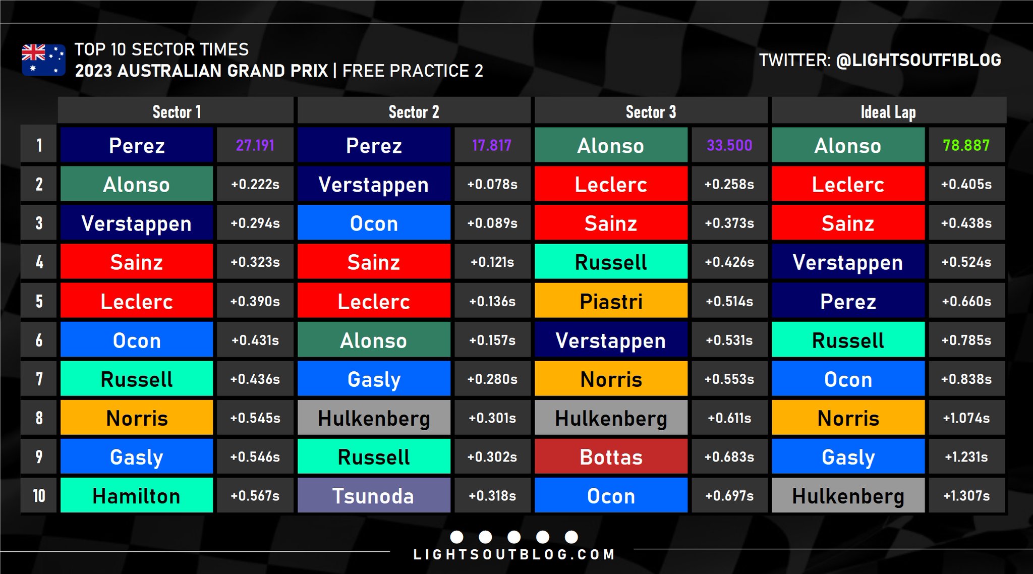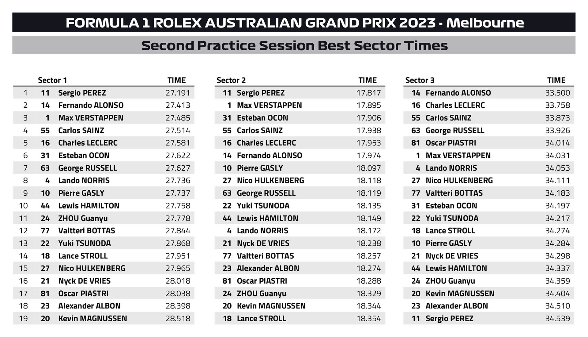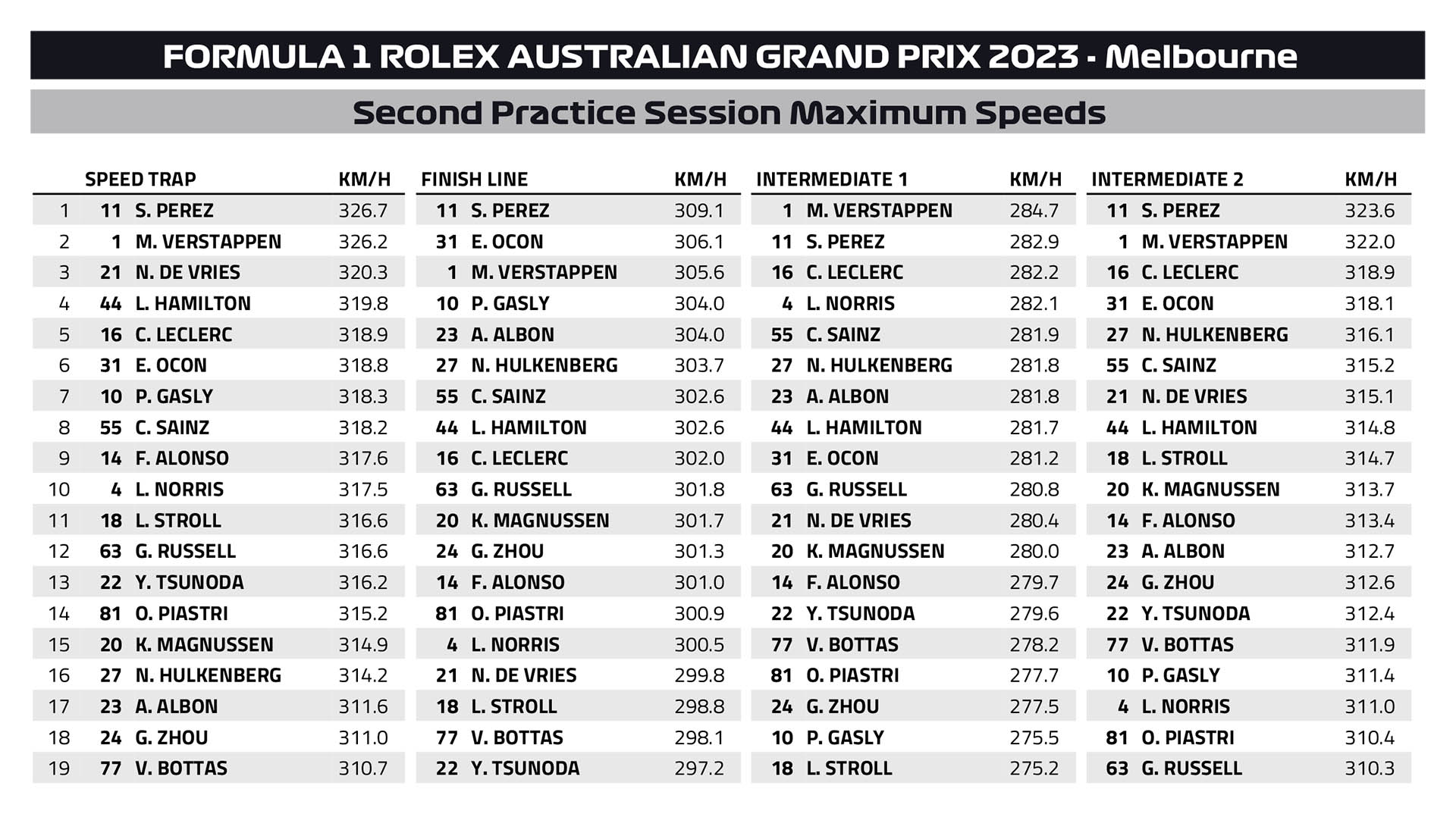 Τον Ολλανδό ακολούθησαν στον πίνακα των χρόνων ο George Russell με τη Mercedes και ο Carlos Sainz με την άλλη Ferrari, εμπρός από τον Esteban Ocon (Alpine). Ο Sergio Perez είδε τους δύο γρήγορους γύρους του να καταστρέφονται επειδή συνάντησε πιο αργούς συνδυασμούς και περιορίστηκε στην 7η θέση, εμπρός από τους Lando Norris (McLaren), Nico Hulkenberg (Haas) και Pierre Gasly με την άλλη Alpine.