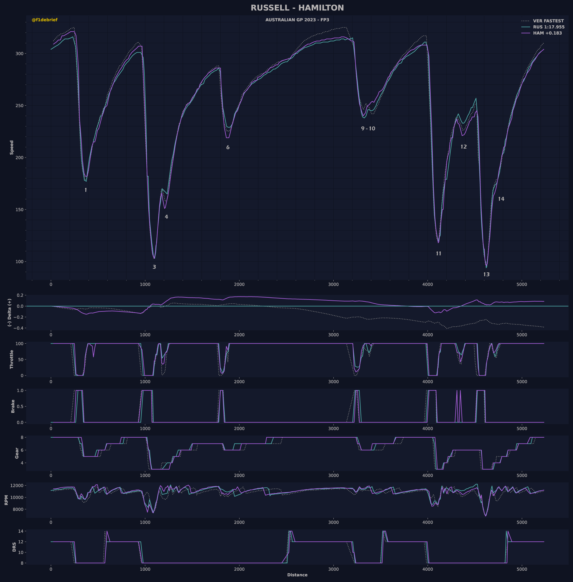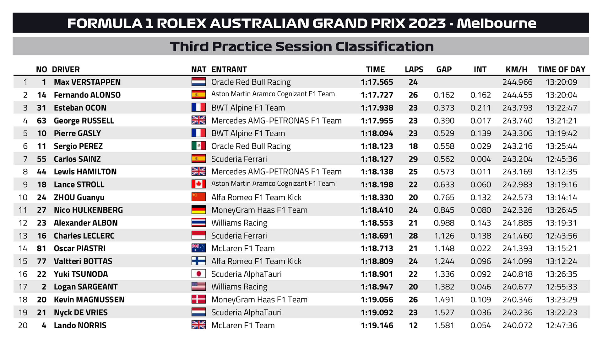 Η Red Bull αποκάλυψε την τελευταία στιγμή τις πραγματικές δυνατότητες του μονοθεσίου της την τελευταία στιγμή στο FP3 του GP Αυστραλίας, την τελευταία ευκαιρία ομάδων και οδηγών να κάνουν αλλαγές στο στήσιμο των μονοθεσίων τους. Κάτι λιγότερο από 10 λεπτά πριν από την καρό σημαία, ο Max Verstappen κατάφερε να σημειώσει την ταχύτερη επίδοση της διαδικασίας, που διεξήχθη σε χαμηλότερες θερμοκρασίες, δημιουργώντας δυσκολίες στους οδηγούς να αναπτύξουν θερμοκρασία στα ελαστικά.
