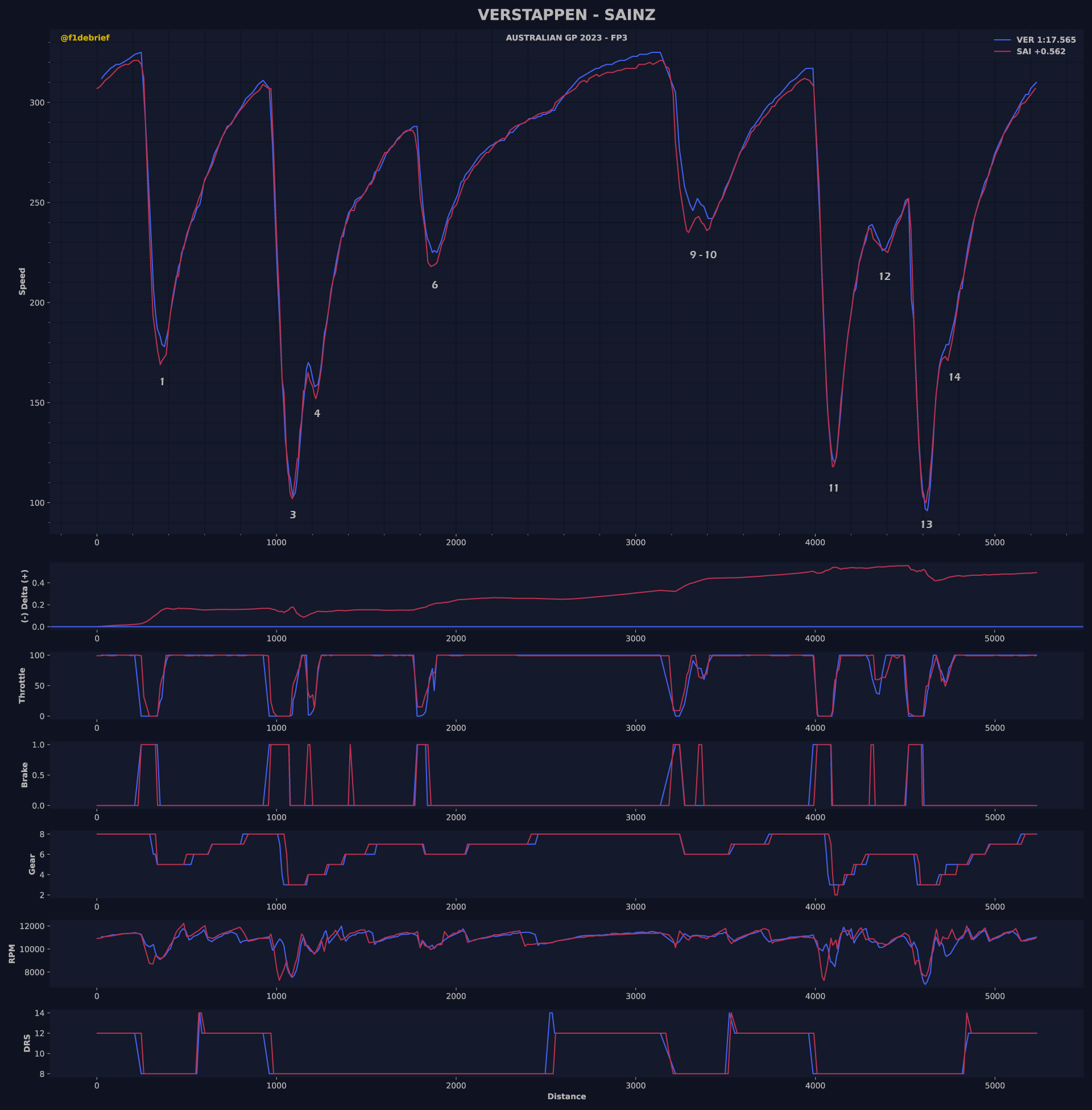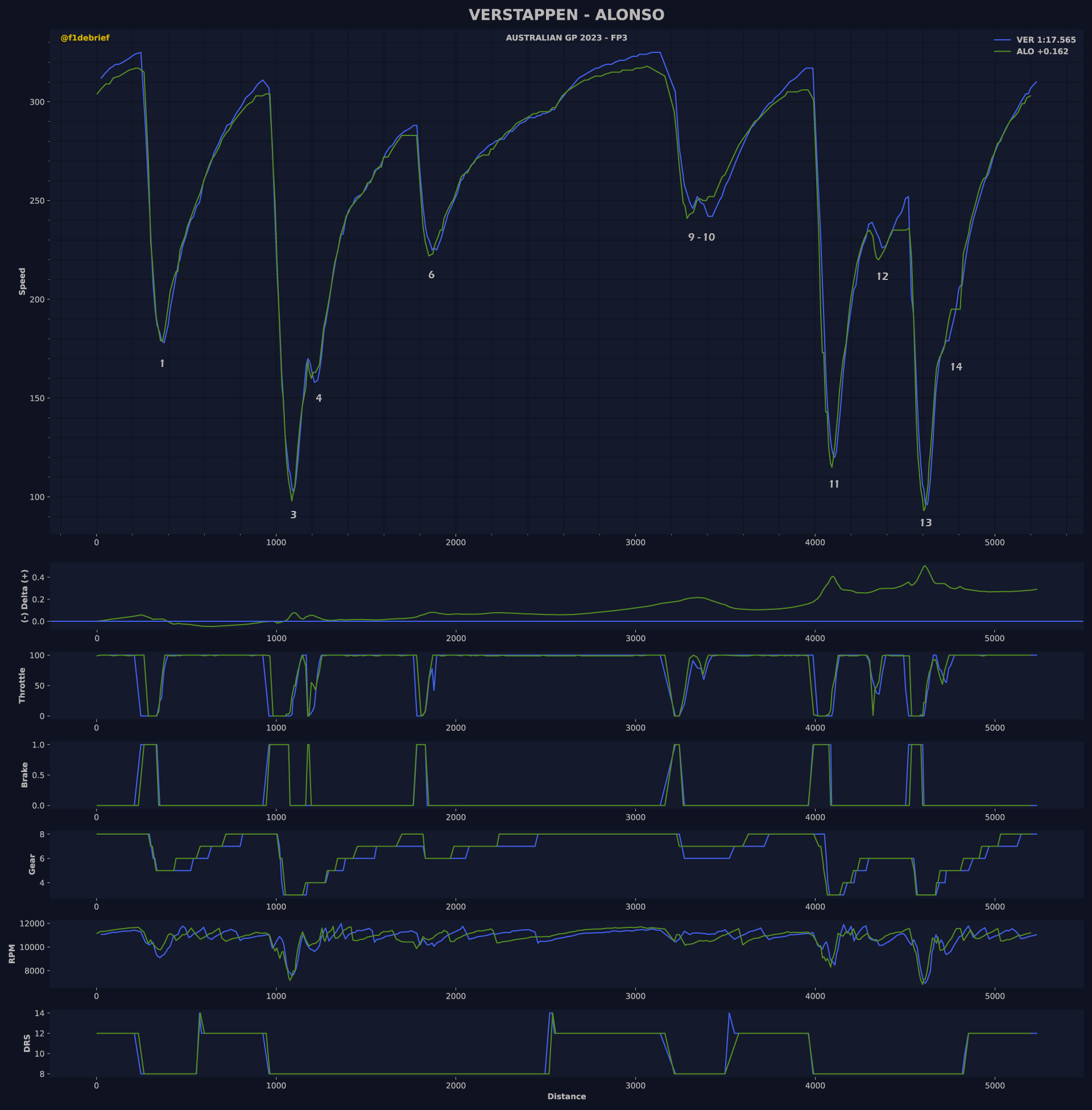 Προς το παρόν, φαίνεται ότι η Red Bull δεν έχει το ίδιο πλεονέκτημα που απολάμβανε στους δύο προηγούμενους αγώνες. Έπειτα από μία δύσκολη Παρασκευή, ο Sergio Perez δυσκολεύτηκε πάρα πολύ με τη μεταβαλλόμενη ισορροπία της RB19, έχοντας πολυάριθμες εξόδους από την πίστα, για να καταλήξει στην 6η θέση. Αντιθέτως, πολύ δυνατή και σταθερή φαινόταν στα χέρια του Fernando Alonso η Aston Martin, επιτρέποντας στον Ισπανό να κινηθεί μόλις 162 χλστ. του δλ. πιο αργά από τον Verstappen, για να καταλάβει τη 2η θέση.