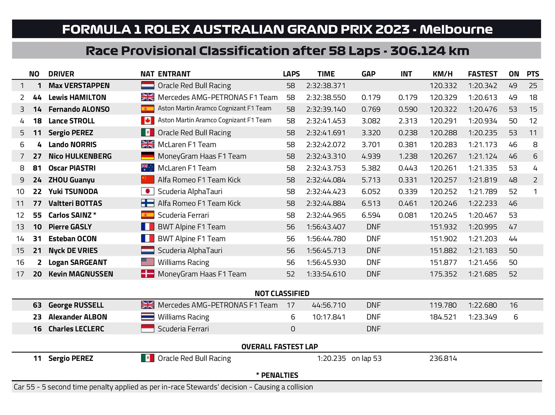Αυτό επανέφερε τον Alonso στην 3η θέση, εμπρός από τους Sainz, Stroll, Perez, Norris, Hulkenberg, Piastri, Zhou, στην πρώτη δεκάδα, με τους Tsunoda και Bottas εκτός βαθμών. Ωστόσο, ο Sainz δέχθηκε ποινή 5 δλ. για το συμβάν με τον Alonso στην επανεκκίνηση, ενώ οι αγωνοδίκες θα ερευνούσαν τη σύγκρουση μεταξύ των δύο Alpine. Λόγω της ποινής, ο Sainz έπεσε στη 12η θέση, εκτός βαθμών, σε μία καταστροφική ημέρα για τη Ferrari.