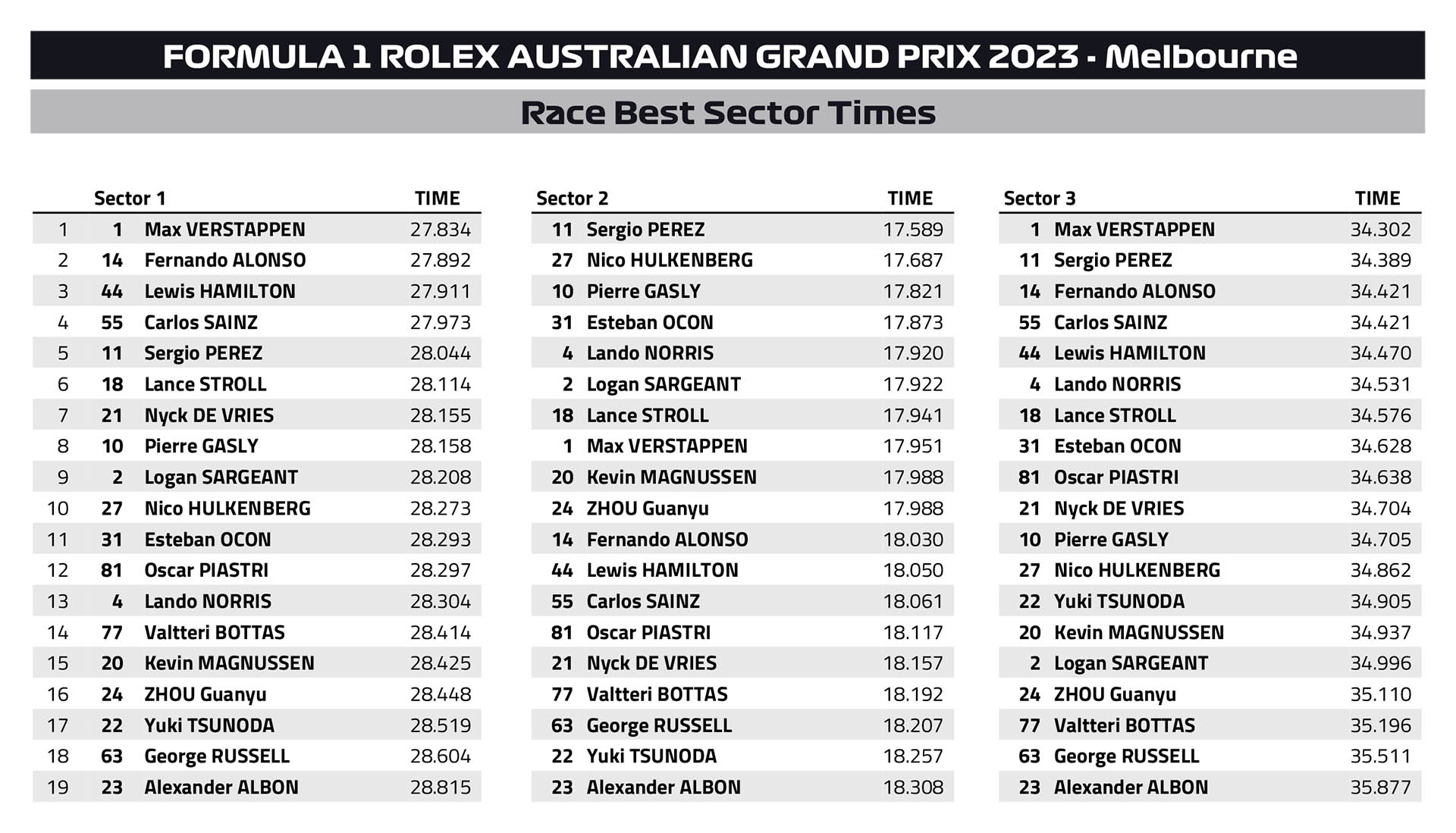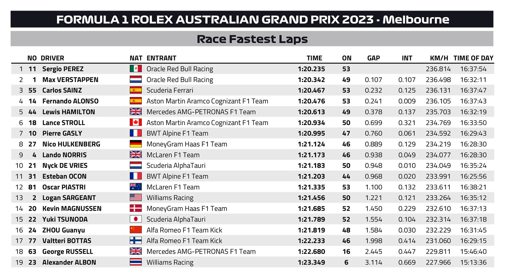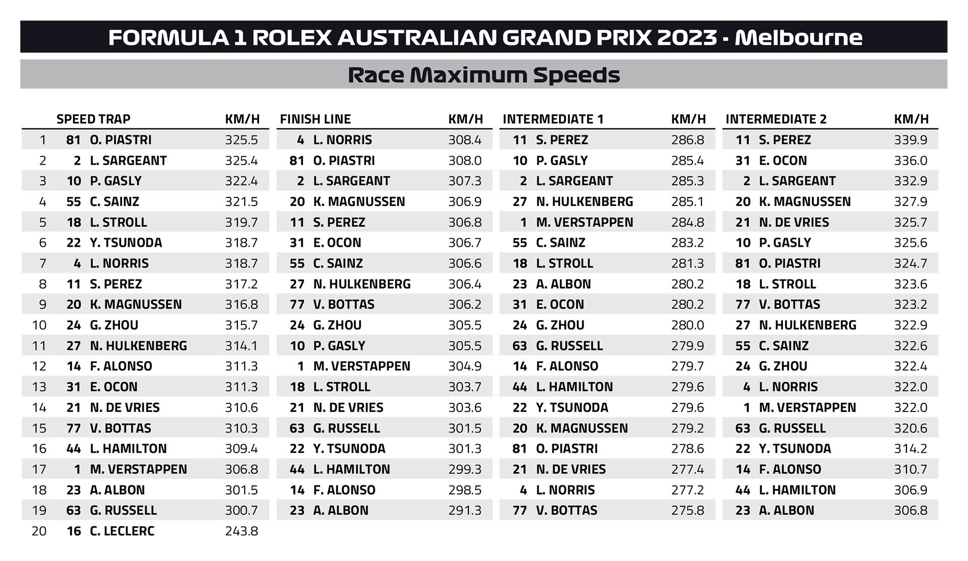 Ο Oscar Piastri σημείωσε τους πρώτους του βαθμούς στη Formula 1 στη γενέτειρά του, τερματίζοντας την 8η θέση, με τη McLaren να βλέπει και τα δύο μονοθέσιά της να βαθμολογούνται. Ο Αυστραλός κατετάγη εμπρός από τον Guanyu Zhou, και τον Yuki Tsunoda, που χάρισε στην AlphaTauri τον πρώτο της φετινό βαθμό. Η τελευταία επανεκκίνηση ήταν καταστροφική για την Alpine, η οποία είχε αμφότερα τα μονοθέσιά της στους βαθμούς και συγκρούστηκαν μεταξύ τους εγκαταλείποντας.