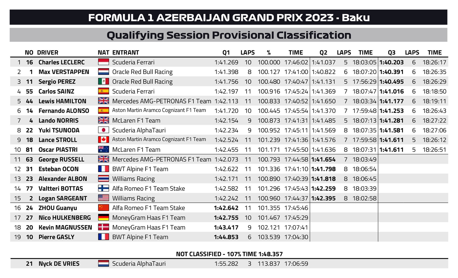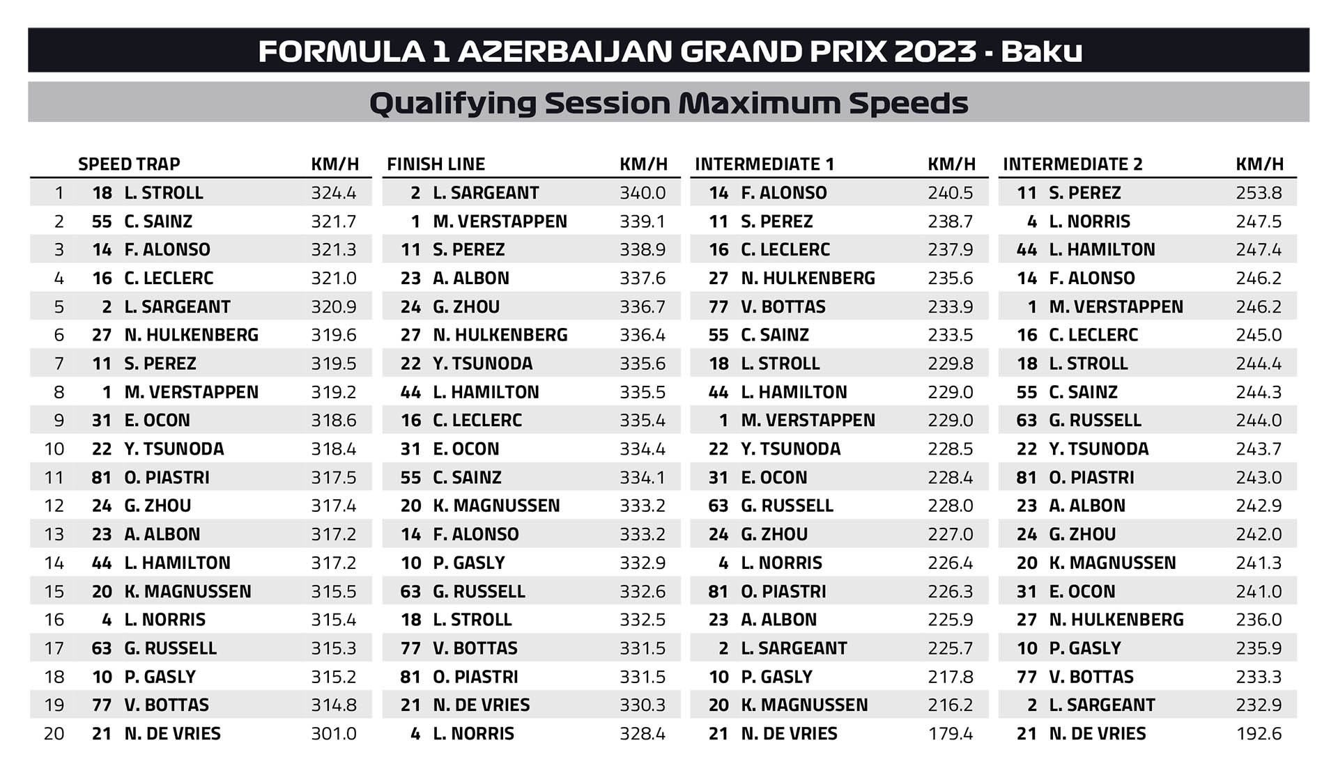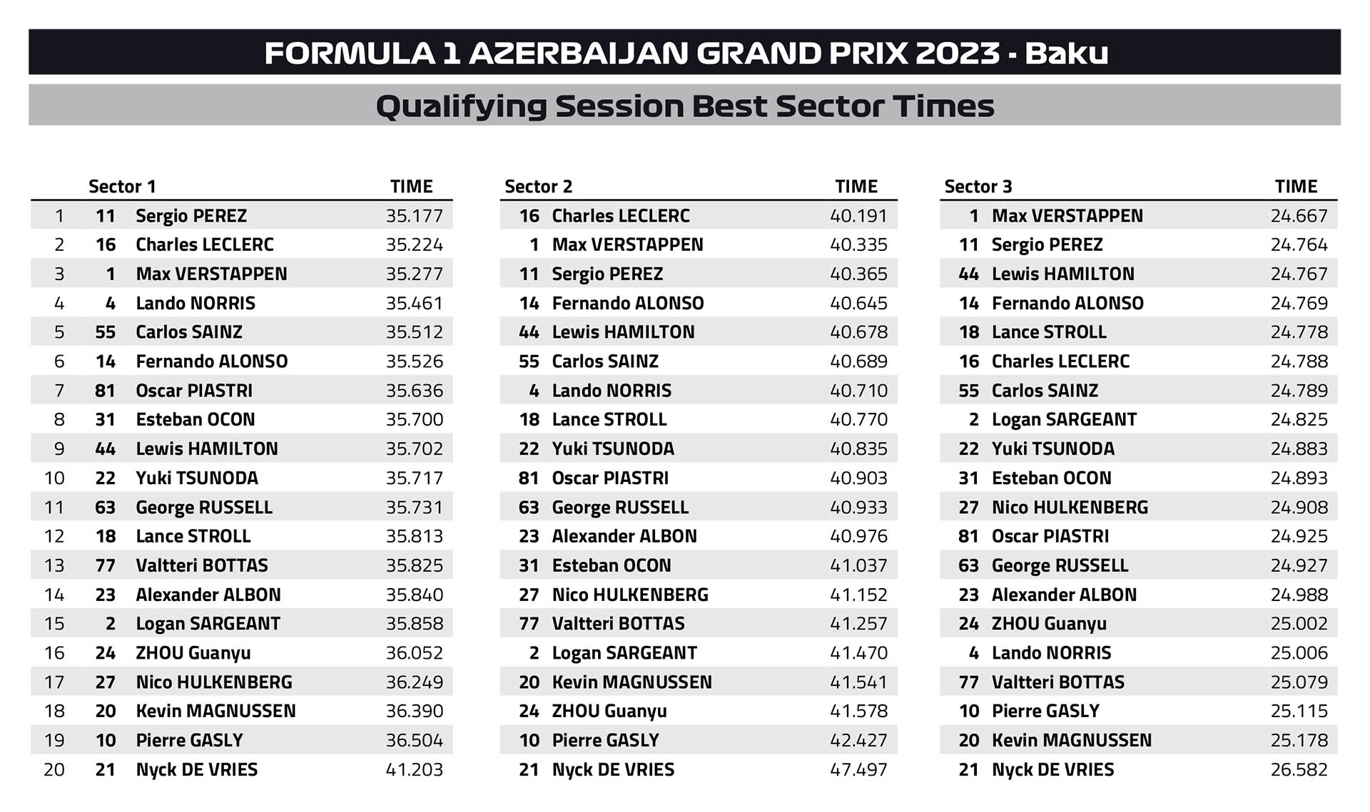 Ο Lance Stroll, που δεν είχε δεύτερο σετ μαλακής γόμας για το Q3 βρέθηκε στην 9η θέση. Το DRS της Aston Martin του Καναδού δεν λειτουργούσε, γεγονός που στο Μπακού μπορεί να κοστίσει έως και 0,6 δλ. στο Μπακού. Ο Oscar Piastri, με τη δεύτερη McLaren σημείωσε ακριβώς τον ίδιο χρόνο με τον Stroll, αλλά επειδή το έκανε αργότερα, θα παραταχθεί πίσω από την Aston Martin στο grid της Κυριακής, συμπληρώνοντας την πρώτη δεκάδα, παρότι δεν αισθανόταν πολύ καλά.