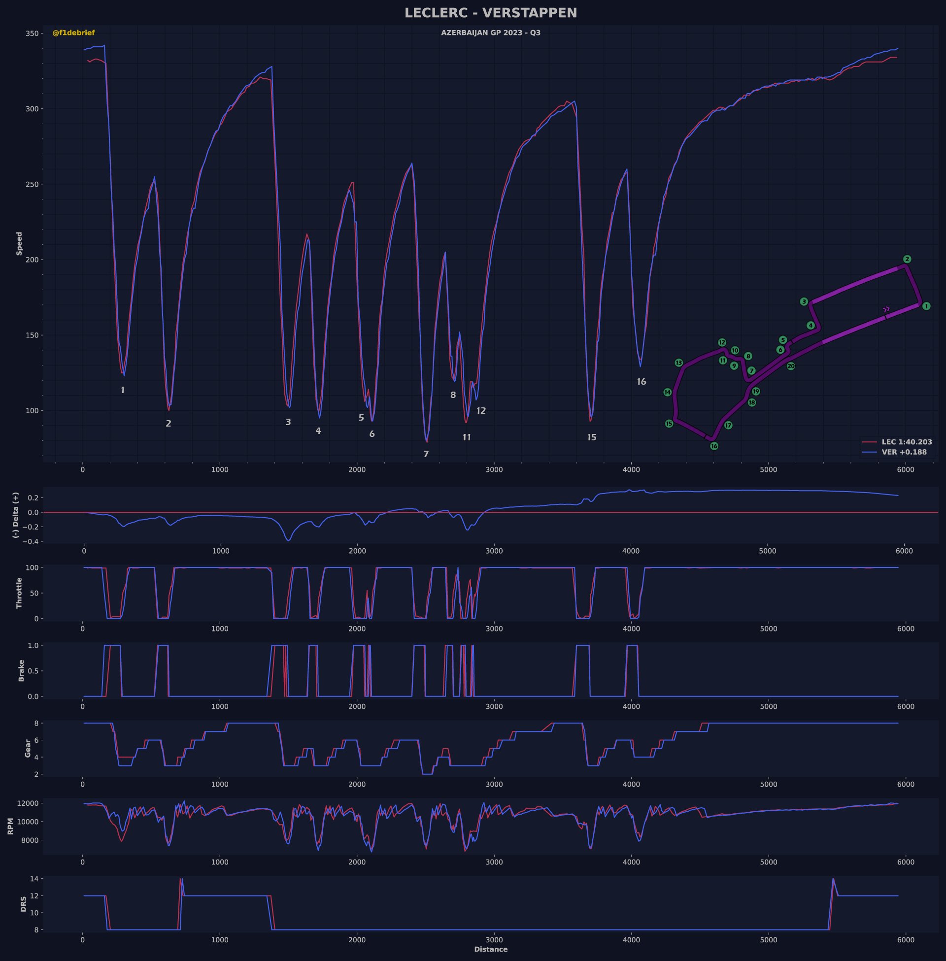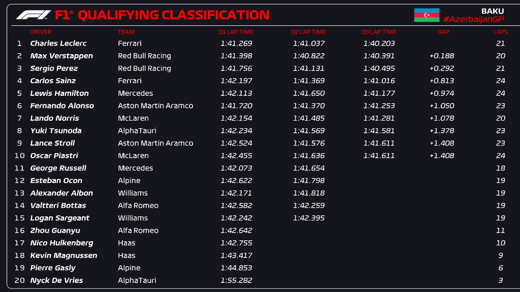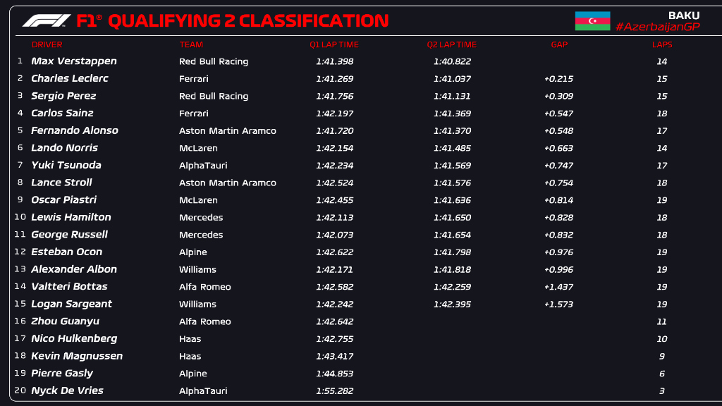 Ο Verstappen βρέθηκε σχεδόν δύο δέκατα του δλ. πίσω από τον Leclerc και ο Perez τρία δέκατα. Ο Carlos Sainz βρέθηκε στην 4η θέση, όντας 0,8 δλ. πιο αργός από τον team-mate του στη Ferrari, καθώς δυσκολευόταν με τα ελαστικά του, που είναι δύσκολο να αναπτύξουν θερμοκρασίες στις κατατακτήριες δοκιμές του Μπακού, ιδιαίτερα αυτά του εμπρός άξονα. Ο Ισπανός δεν είχε την αίσθηση που θα ήθελε στο πρώτο sector, αλλά δεν είχε δύο σετ μαλακής γόμας για το Q3, λόγω λάθους στο πρώτο σκέλος που του κόστισε ένα σετ ελαστικών.