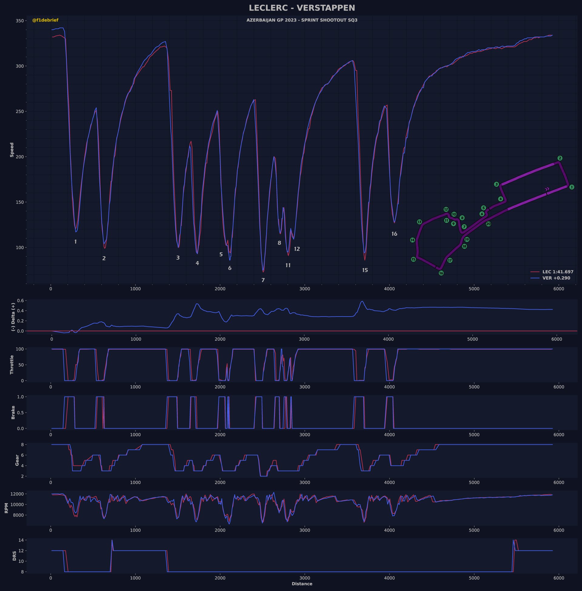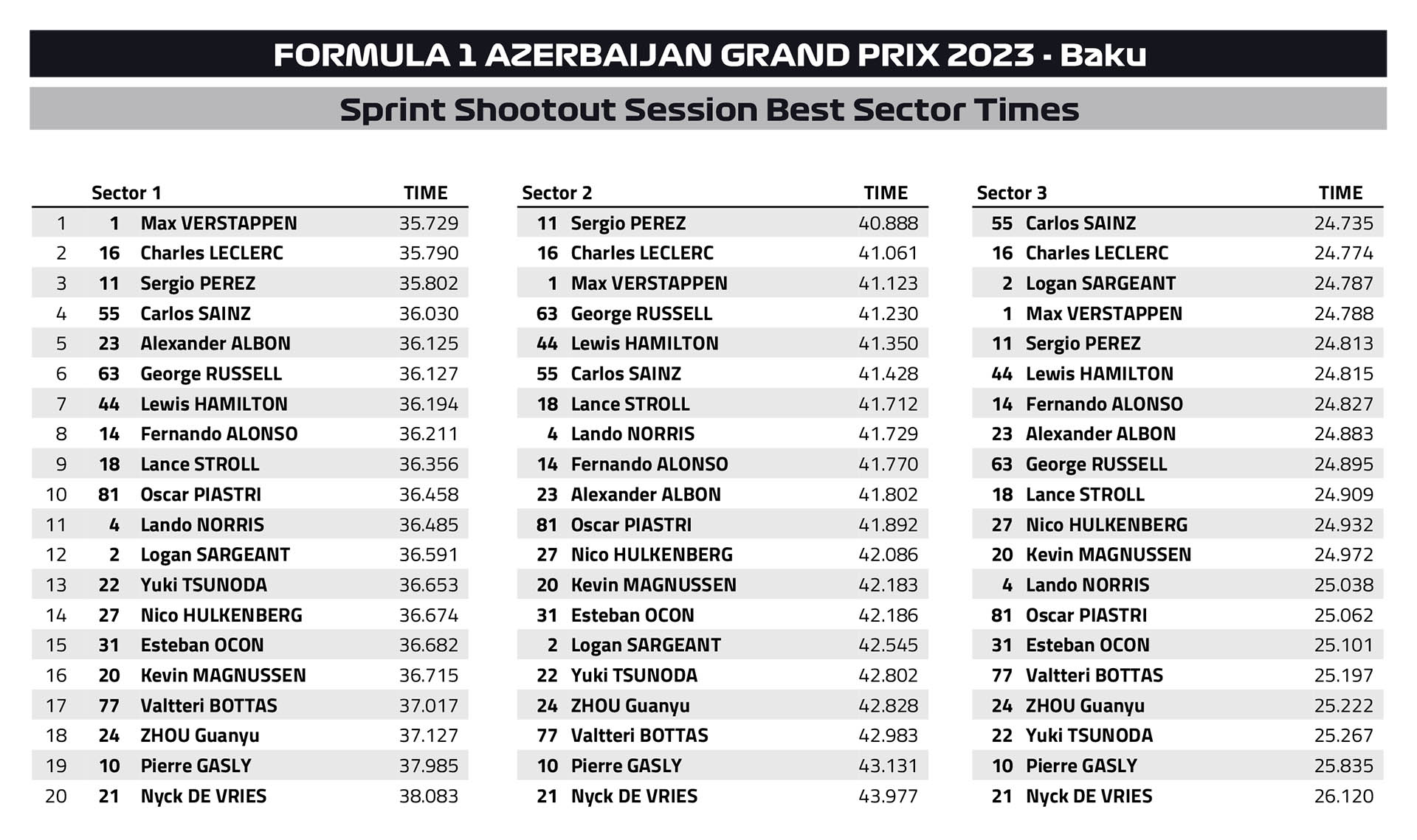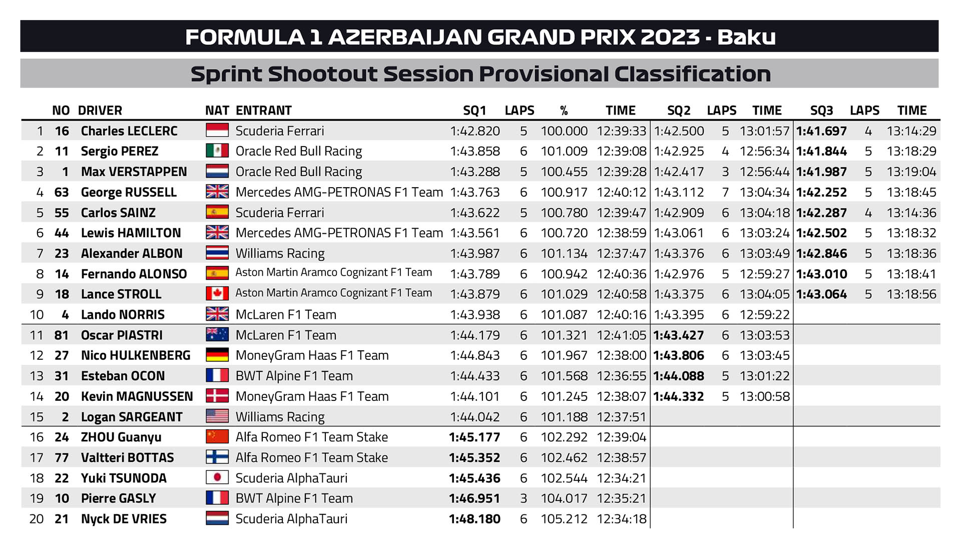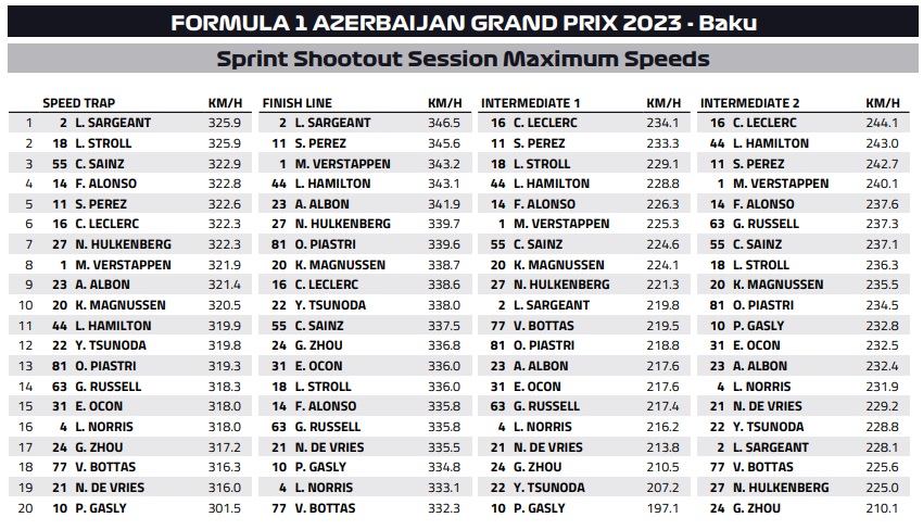 Το πρώτο sprint shootout στην ιστορία της Formula 1 έλαβε χώρα στο Μπακού του Αζερμπαϊτζάν σε υψηλότερες θερμοκρασίες από τις χθεσινές και με την Pirelli να έχει αυξήσει τις ελάχιστες πιέσεις των ελαστικών κατά 1 psi από την Παρασκευή. Ο Charles Leclerc, με το 1:41.697 που είχε σημειώσει στην πρώτη του γρήγορη προσπάθεια στο 3ο σκέλος της διαδικασίας, είχε τη δυνατότητα να εξασφαλίσει την πρώτη θέση εκκίνησης για το σπριντ, παρότι κατέληξε στον τοίχο στις τελικές στιγμές του SQ3. O Μονεγάσκος οδηγός της Ferrari, που εξασφάλισε εχθές και την pole position για τον αγώνα της Κυριακής, έχασε το πίσω μέρος της Ferrari στη στροφή 5.
