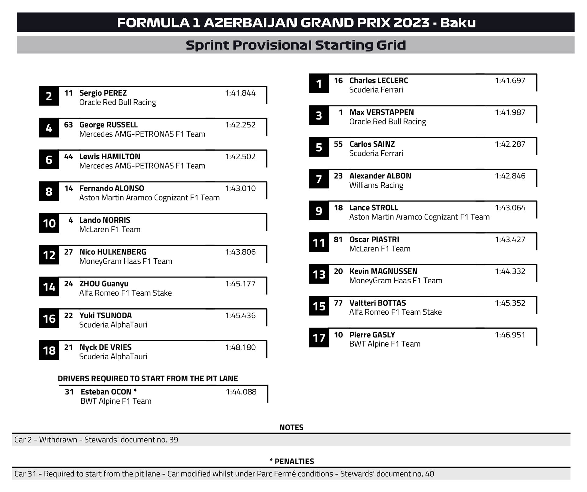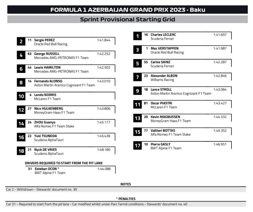 H γαλλική ομάδα απέσυρε το μονοθέσιο του Esteban Ocon από το καθεστώς parc ferme για να πραγματοποιήσει αλλαγές επάνω του και να βελτιώσει το στήσιμο, με αποτέλεσμα ο Γάλλος να εκκινήσει το σπριντ και τον αγώνα της Κυριακής από το pit lane. Παράλληλα, η Williams απέσυρε το μονοθέσιο του Logan Sargeant από το σπριντ, καθώς οι μηχανικοί της δεν προλάβαιναν να το επισκευάσουν εγκαίρως.