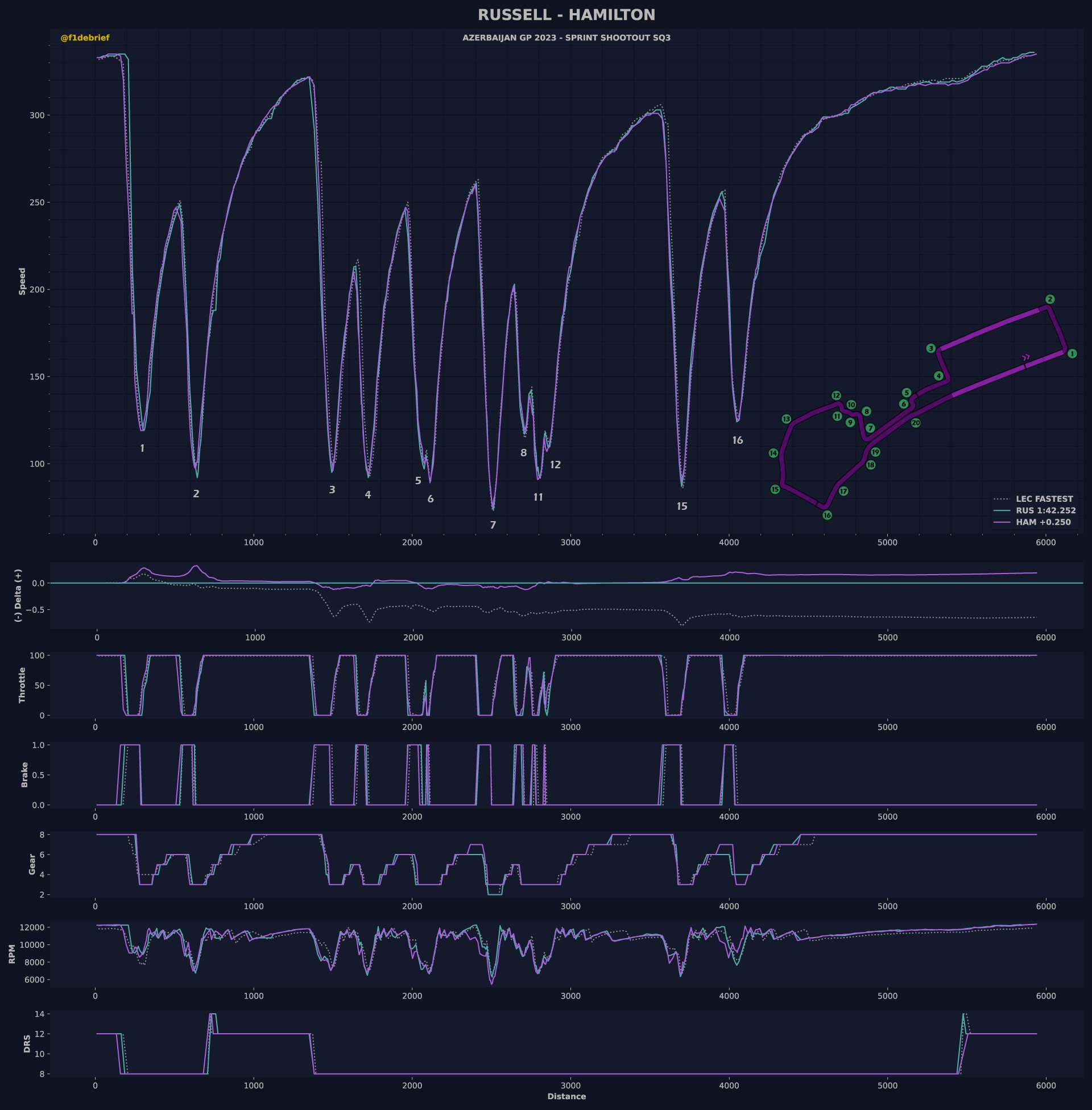 Πίσω από τον Ισπανό κατετάγη ο Lewis Hamilton με τη δεύτερη Mercedes, 0,8 δλ. μακριά από την κορυφή. Ο Βρετανός Πρωταθλητής, που δυσκολεύτηκε με το πίσω μέρος της Mercedes και ανέφερε ότι δεν είχε slipstream στην τελική του προσπάθεια, θα παραταχθεί στο σπριντ εμπρός από τον πολύ καλό Alex Albon. Ο Ταϊλανδός εκμεταλλεύτηκε την μειωμένη οπισθέλκουσα της Williams για να βρεθεί εμπρός από τις δύο Aston Martin, οι οποίες αντιμετώπισαν και πάλι προβλήματα με τη λειτουργία του DRS της AMR23 και κατέληξαν στην 8η (Fernando Alonso) και 9η θέση (Lance Stroll).