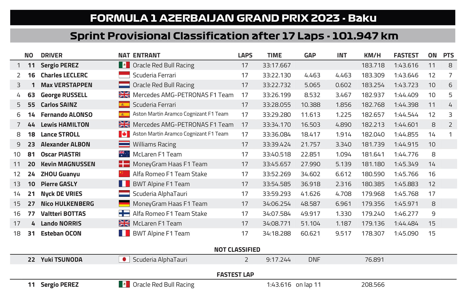 Ο Sergio Perez κυριάρχησε το σπριντ του GP Αζερμπαϊτζάν, ολοκληρώνοντας τους 17 γύρους με διαφορά σχεδόν 5 δλ. από τον Charles Leclerc, που είχε εκκινήσει από την pole position. Ο Μεξικανός οδηγός της Red Bull κατάφερε να προσπεράσει τον Leclerc λίγο μετά την επανεκκίνηση. O Μονεγάσκος οδηγός της Ferrari κατάφερε να διατηρήσει πίσω του τον Max Verstappen έως τον τερματισμό, στην πιο ενδιαφέρουσα μάχη του σπριντ.